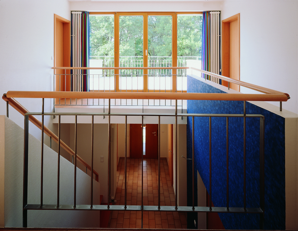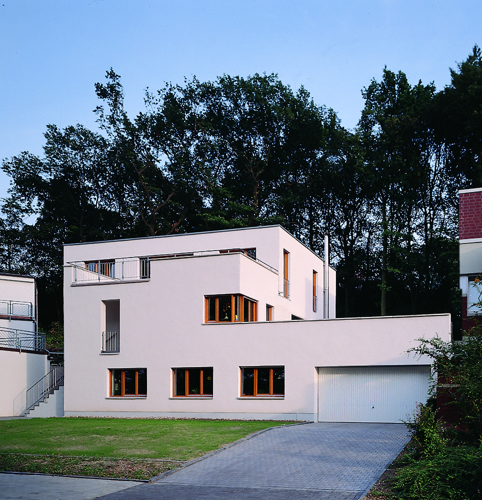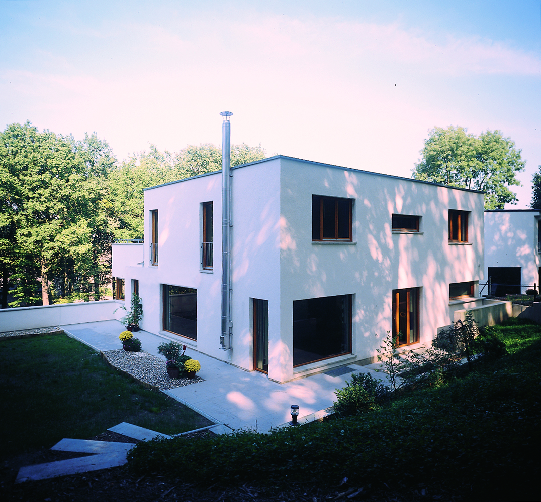 Es galt, dass auf einem Nordhang gelegene Grundstück mit einem Einfamilienhaus so zu bebauen, dass es ausreichend mit Sonnenlicht durchflutet wird. Über eine zweigeschossige Wohnhalle wird das Sonnenlicht in die Tiefe des Hauses geleitet, das bis in alle Räume eine warme und angenehme Atmosphäre schafft. Die zentrale Wohnhalle ist das räumlich verbindende Element der Wohnräume im Erdgeschoss und der Privaträume Im Obergeschoss.