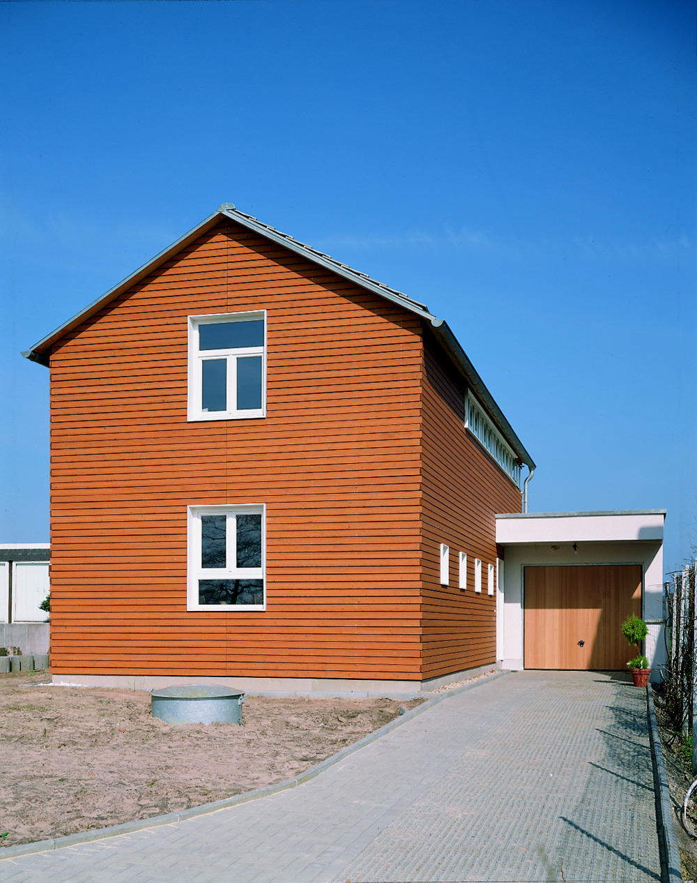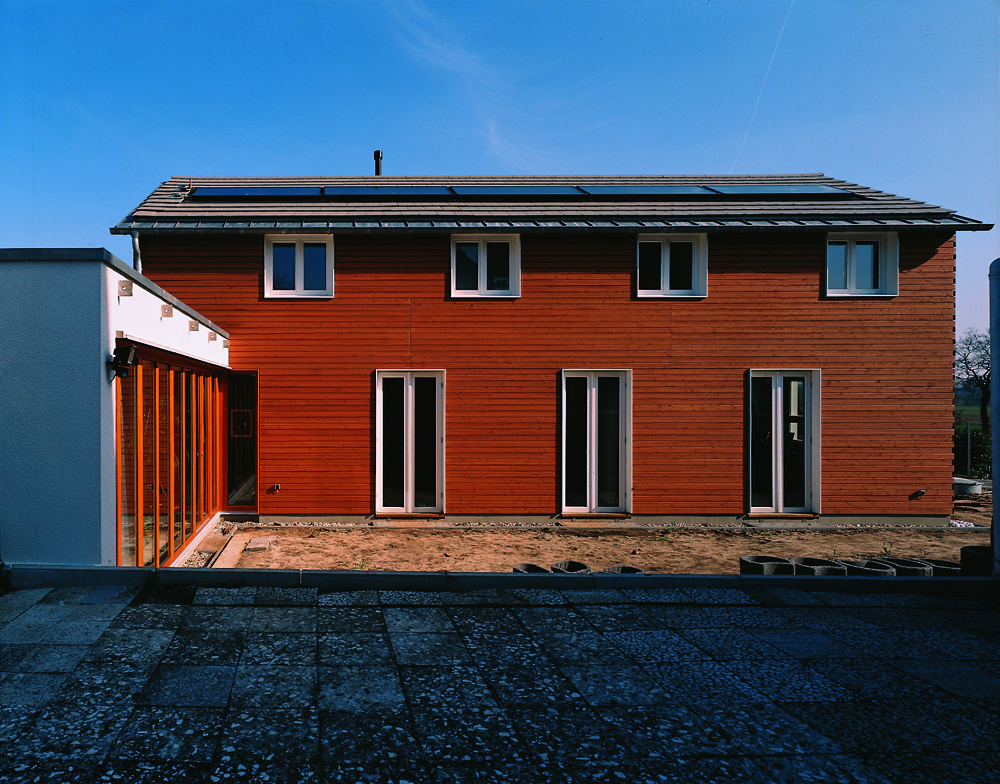 Die Idee beruht auf dem Gedanken zweier sich durchdringender Baukörper. Das Steinhaus umschließt das Holzhaus und bildet das Rückgrat zur offenen Landschaft, das Holzhaus orientiert sich zum Garten. Das Holzhaus wurde durch eine Holzrahmen- und Tafelbauweise weitestgehend vorgefertigt und konnte in 3 Monaten komplett erstellt werden.