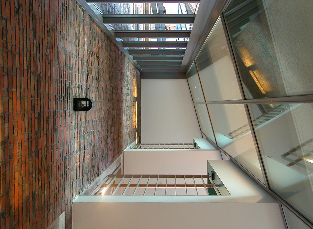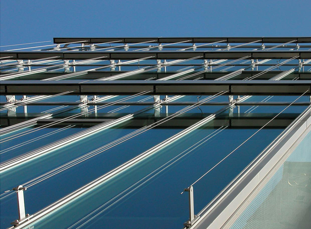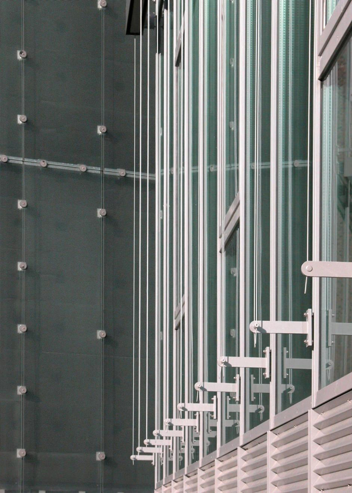 Im Sinne von „Low tech statt High tech“ wurde anhand einer thermischen Gebäudesimulation das energetische Konzept entwickelt. Statt einer kompletten Auflösung von Tragwerk (Stützen und Deckenplatten) und Fassade wurden an den Stirnseiten versetzt angeordnete Betonwände, neben den massiven Betondecken als zusätzliche thermische Speichermasse herangezogen. So konnte mit minimalen technischen Aufwand, außenliegender Sonnenschutz und gesteuerte Nachlüftung, die Stundenzahl mit Temperaturen über 26 C° im Sommer um 70 % reduziert werden.