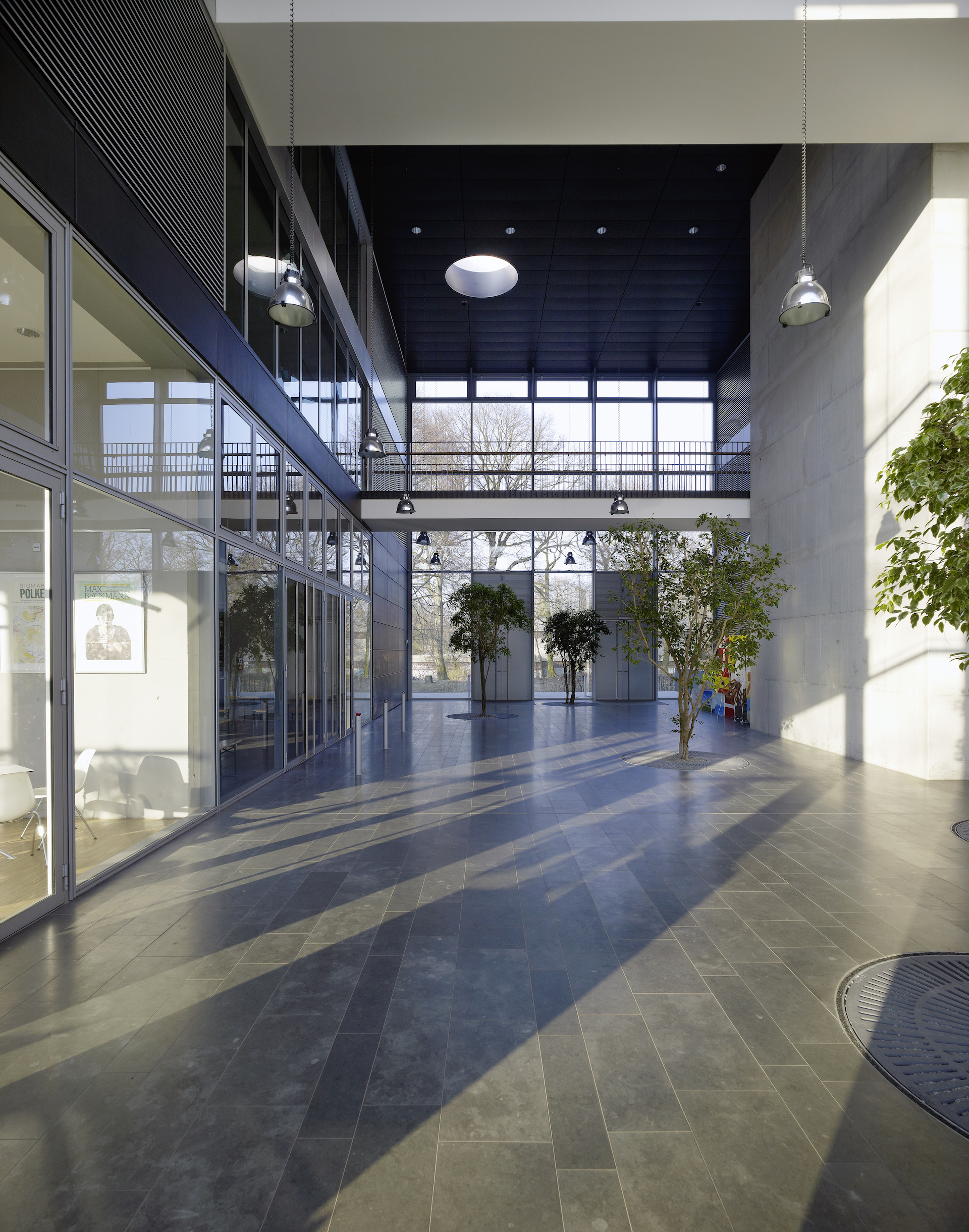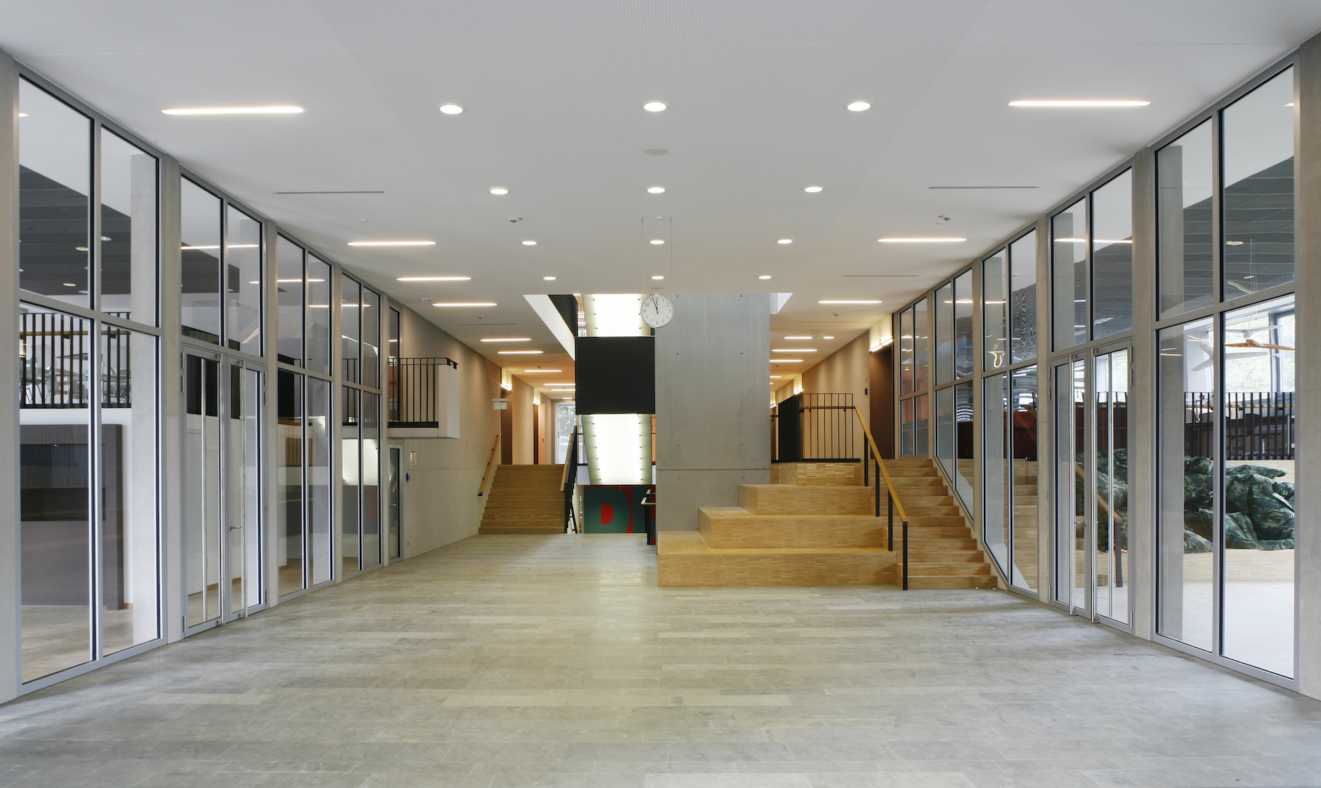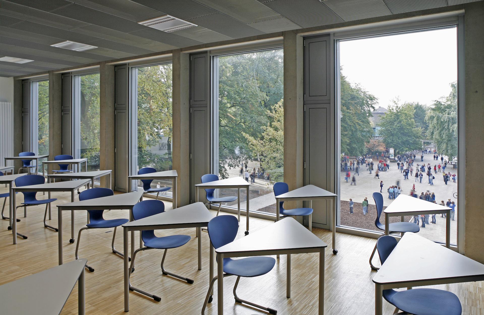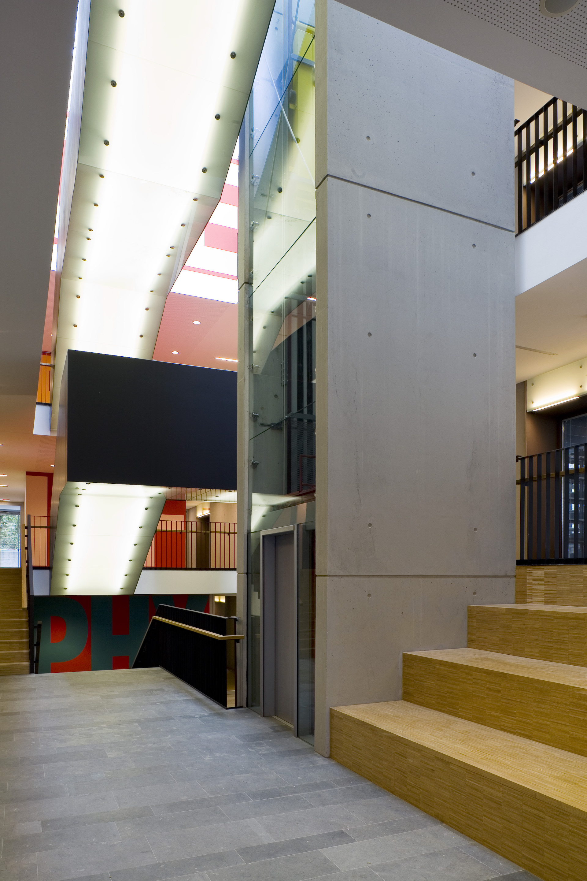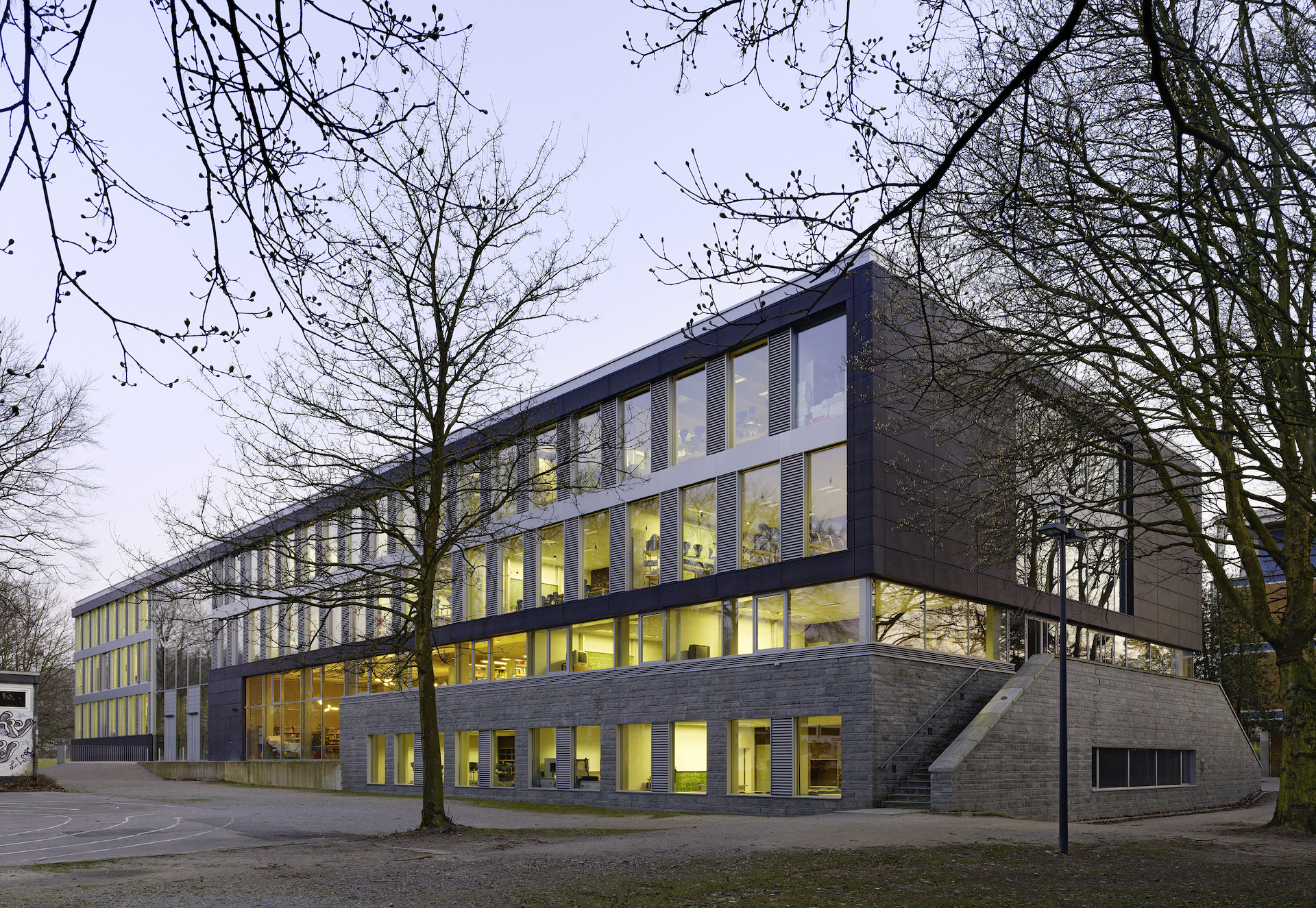 Der Neubau des naturwissenschaftlichen Klassentraktes enthält 22 Fachklassen, eine Biblio-/Mediothek sowie einen Schüleraufenthaltsbereich mit Ganztagsbetreuung. Er arrondiert das Ensemble der Schule und schließt auf der Westseite den Schulhof räumlich zu einem neuen zentralen Platz. Im Innenraum bieten der Eingangsbereich und die Erschließungsräume vielfältige Raum- und Blickbeziehungen, welche die Basis für eine angenehme und abwechslungsreiche Aufenthaltsqualität bilden. Die Fassaden des Neubaus sind großzügig aufgeglast und mit Zinkblech verkleidet.