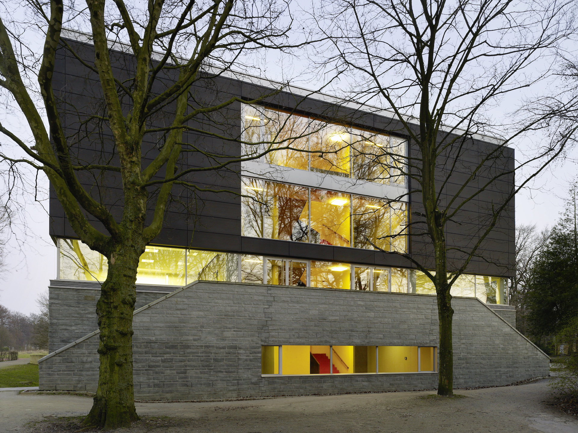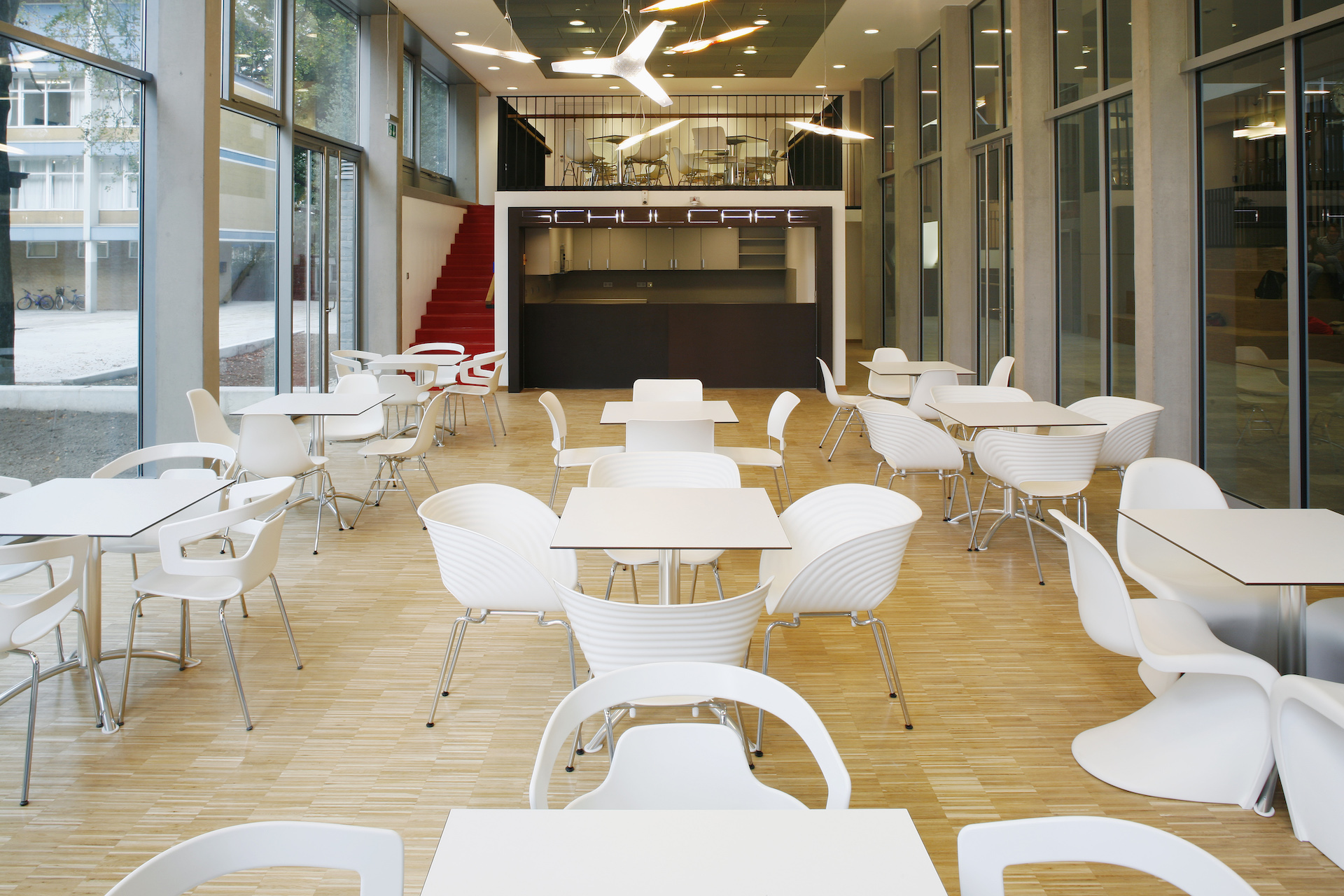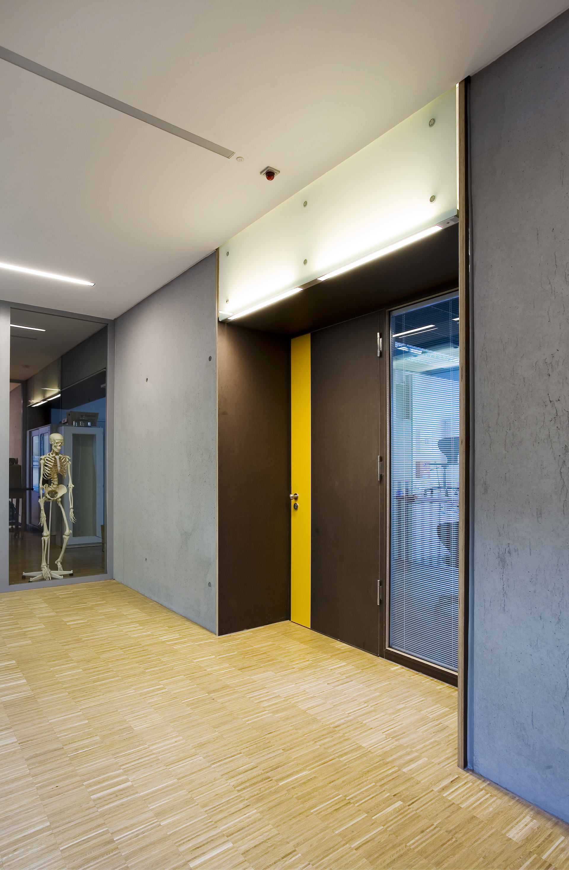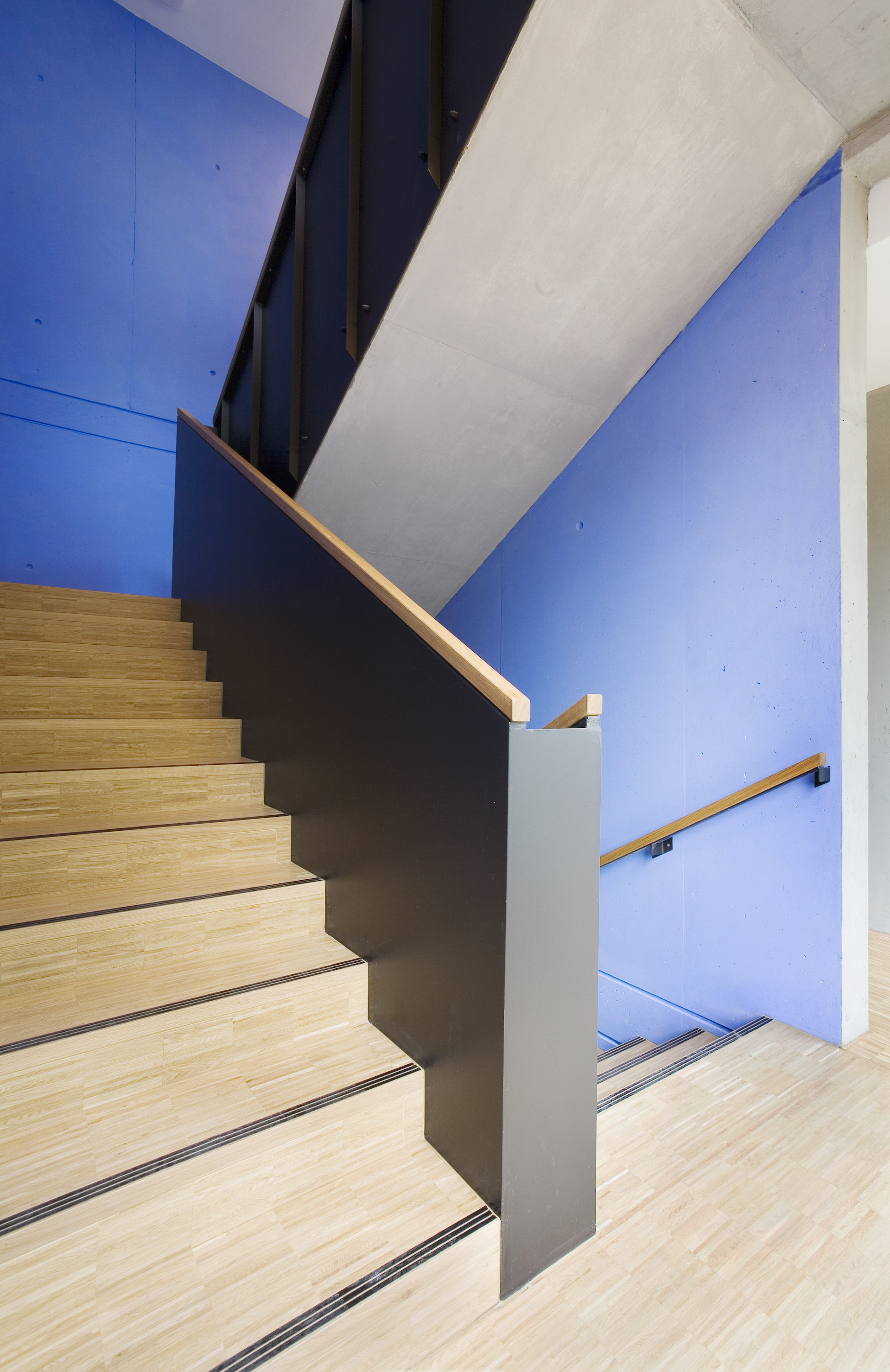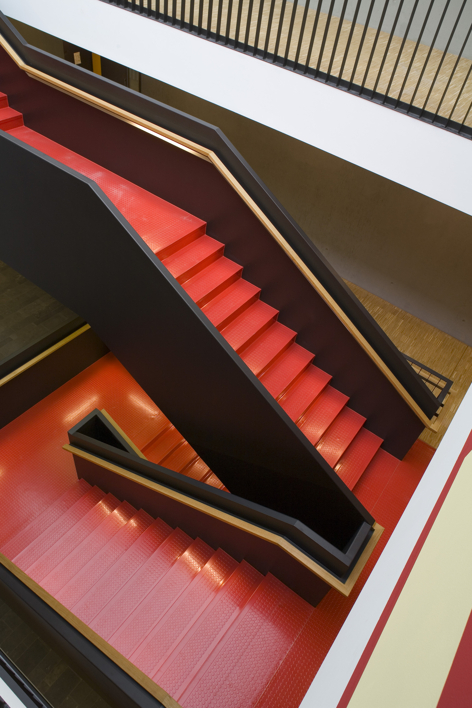 Der Neubau des naturwissenschaftlichen Klassentraktes enthält 22 Fachklassen, eine Biblio-/Mediothek sowie einen Schüleraufenthaltsbereich mit Ganztagsbetreuung. Er arrondiert das Ensemble der Schule und schließt auf der Westseite den Schulhof räumlich zu einem neuen zentralen Platz. Im Innenraum bieten der Eingangsbereich und die Erschließungsräume vielfältige Raum- und Blickbeziehungen, welche die Basis für eine angenehme und abwechslungsreiche Aufenthaltsqualität bilden. Die Fassaden des Neubaus sind großzügig aufgeglast und mit Zinkblech verkleidet.