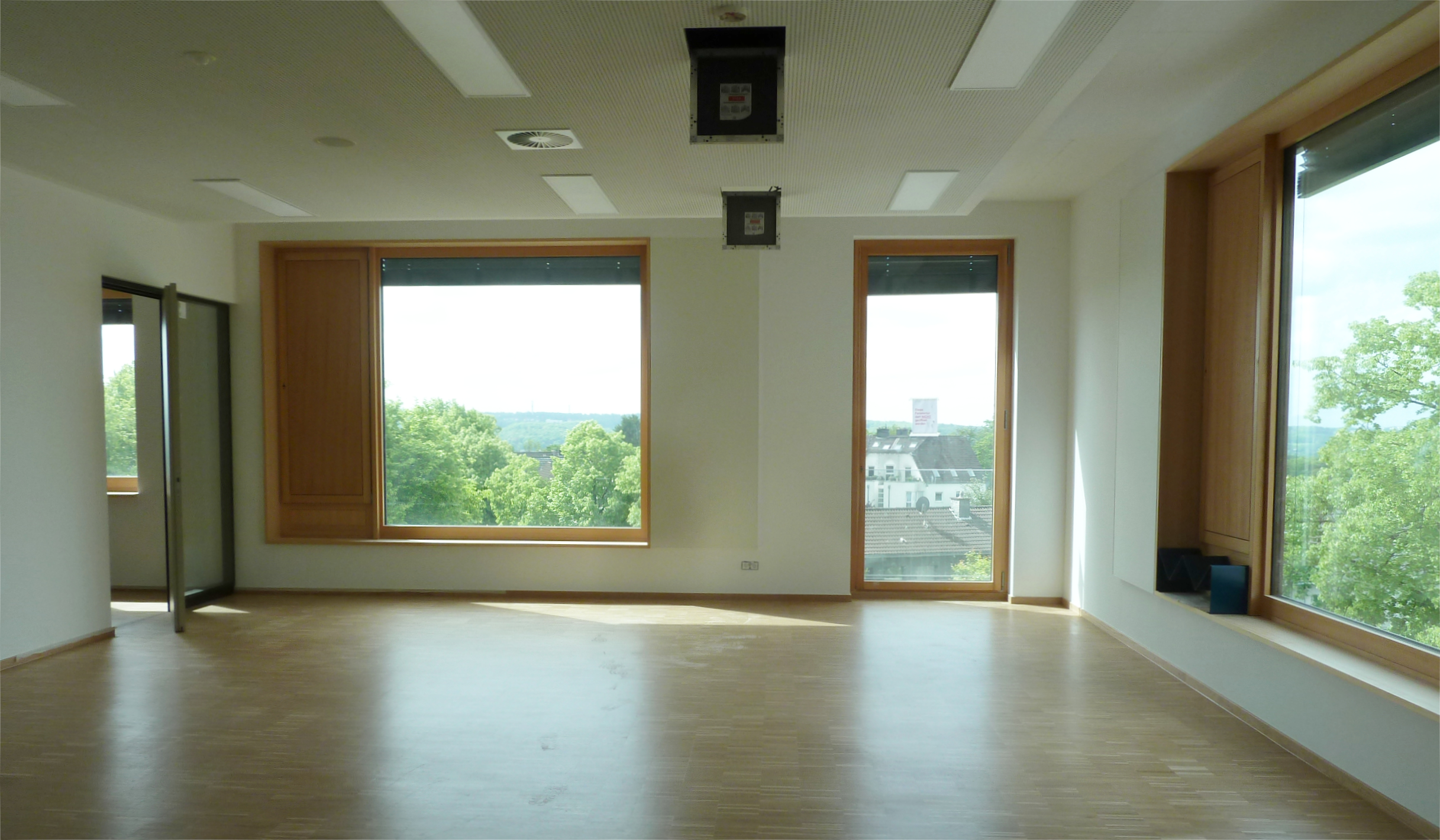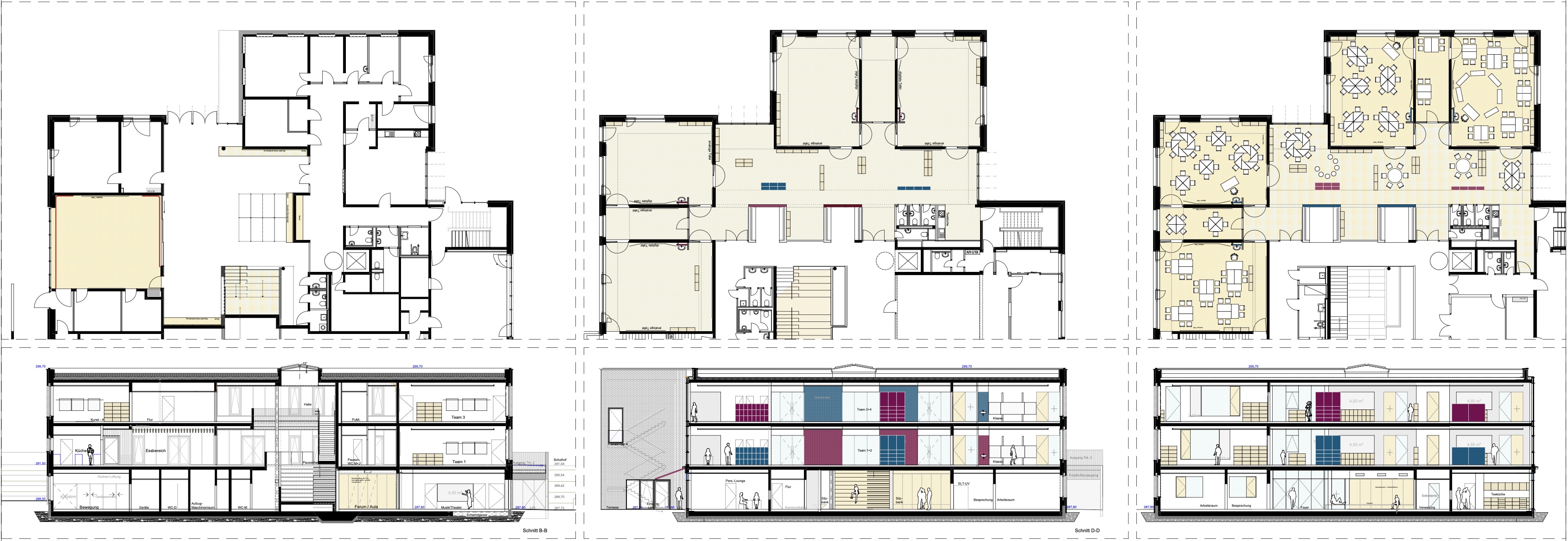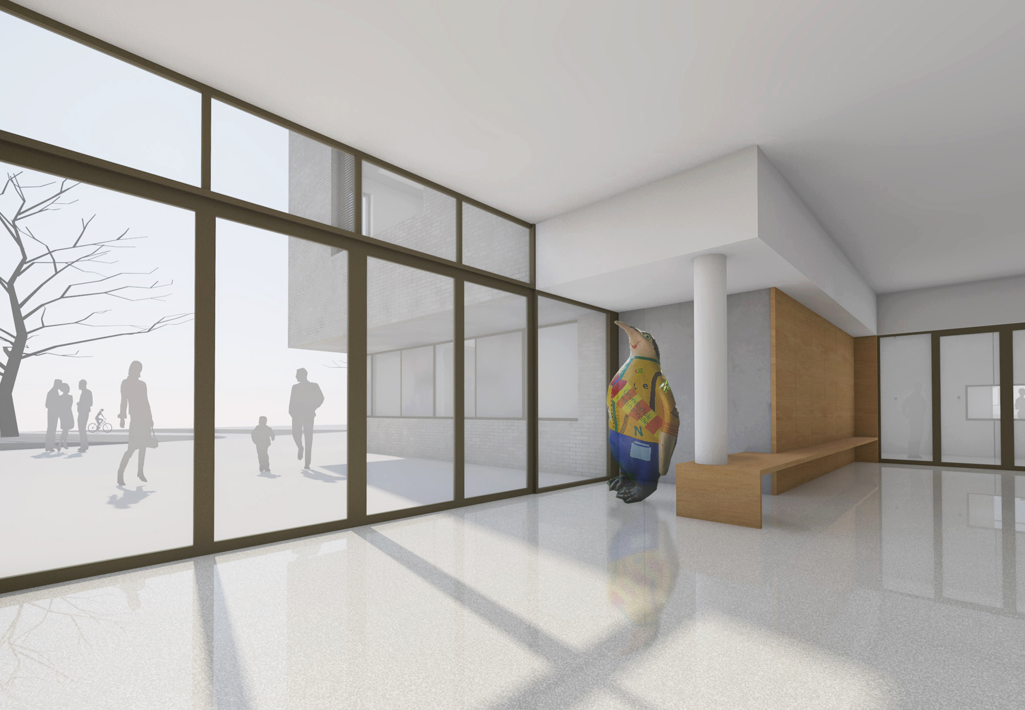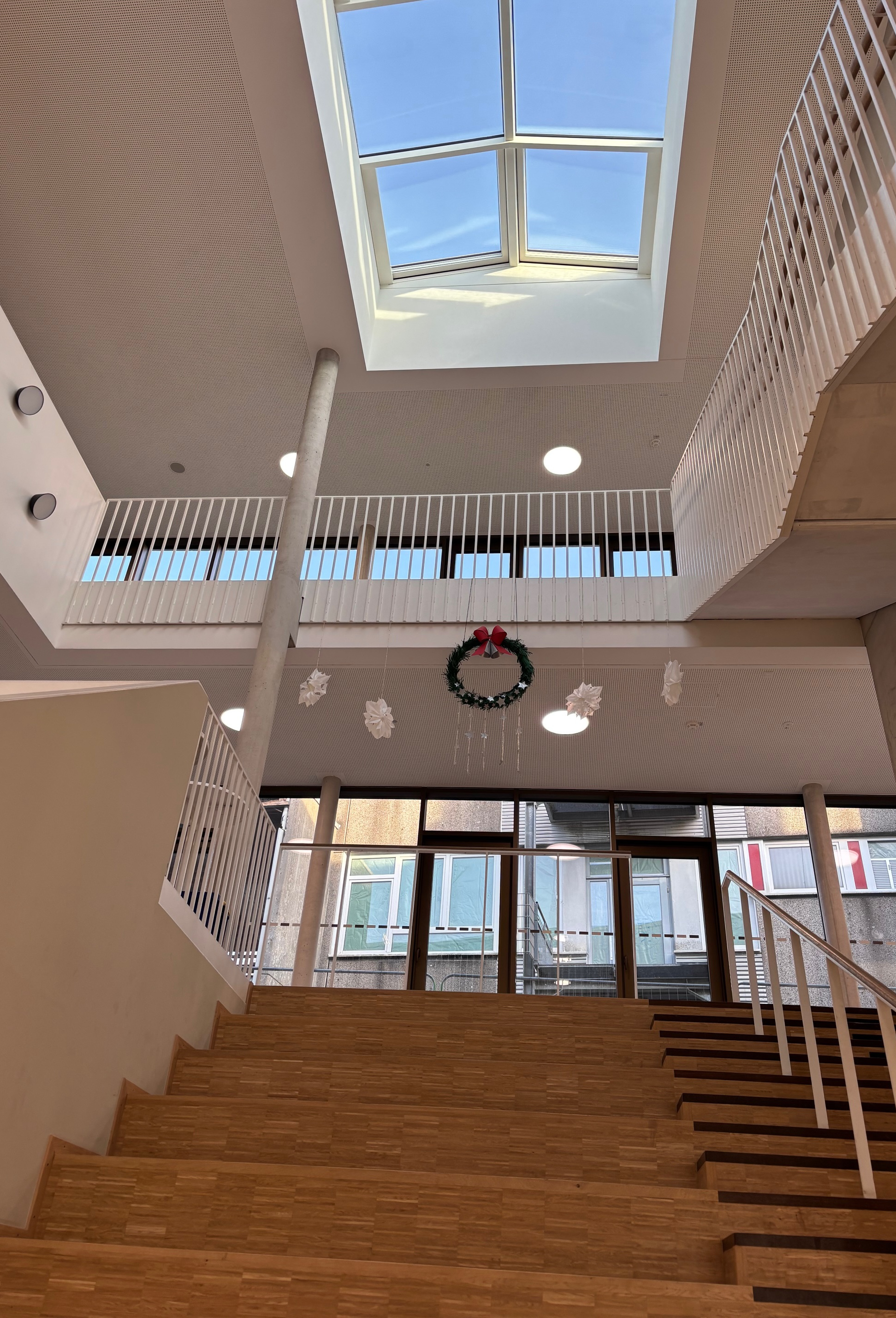 Das Foyer für die Verwaltung und Besucher wird vom südlichen Vorplatz barrierefrei und vom öffentlichen Raum aus erschlossen. Die Schüler:innen betreten das Gebäude direkt vom erdgeschossig gelegenen Schulhof auf der Nordseite in die hier angeordnete Eingangshalle. Aus der Verbindung dieser beiden Ebenen über eine Treppen- und Sitzstufenanlage wird das Foyer mit der Pausenhalle zur Aula / Forum und Versammlungsstätte.