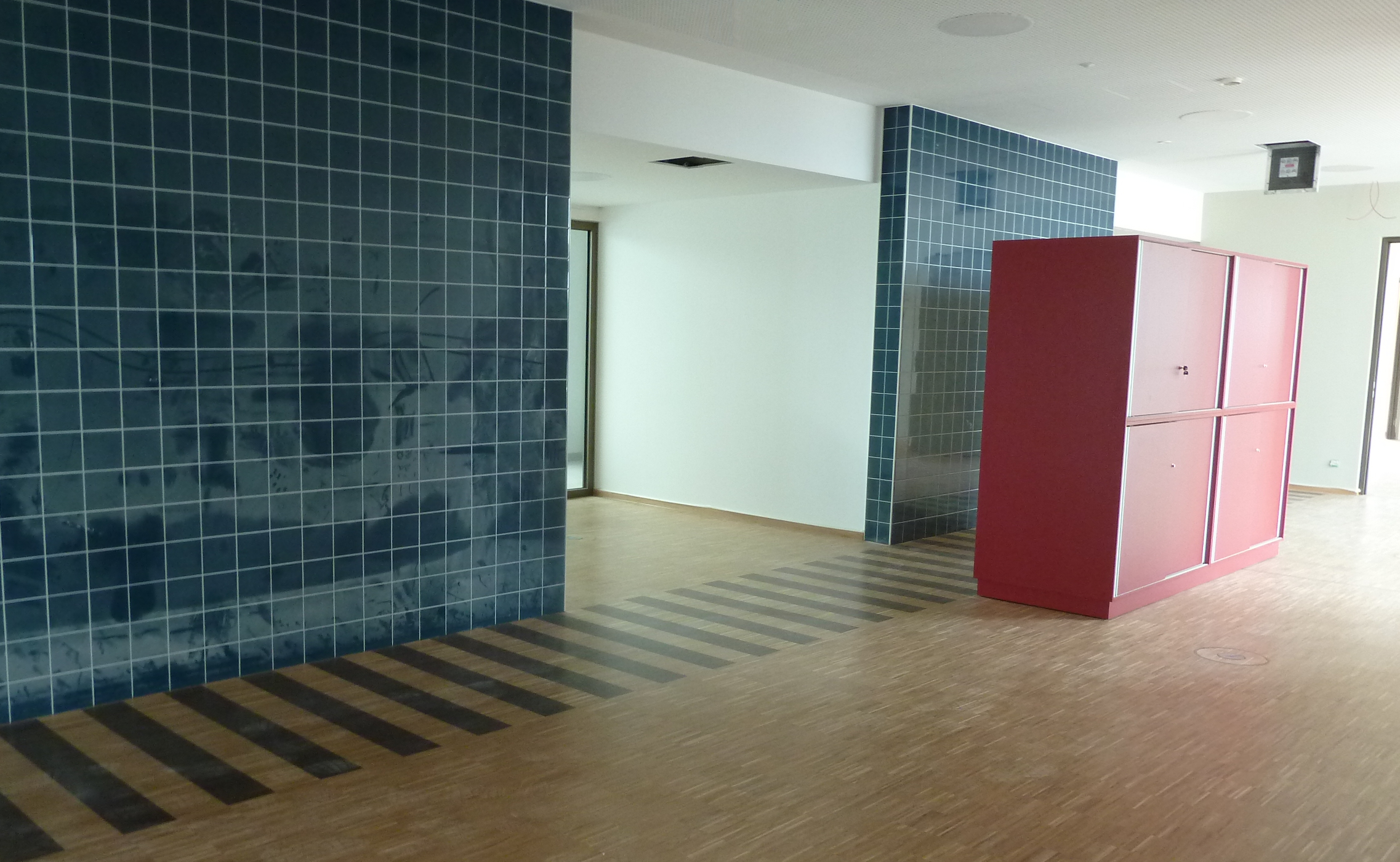 Durch das Gefälle im Gelände des Baufeldes mit ca. drei Metern in Nord-Südrichtung wird ein Hanggeschoss entwickelt, welches die Durchwegung des Gebäudes vom Vorplatz an der Kreuzung bis zum Schulhof im Erdgeschoss über eine offene lichtdurchflutete dreigeschossige Halle ermöglicht.