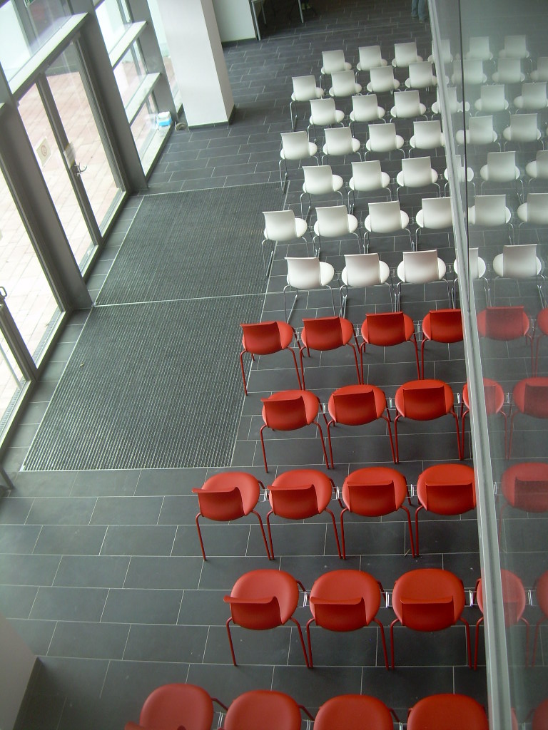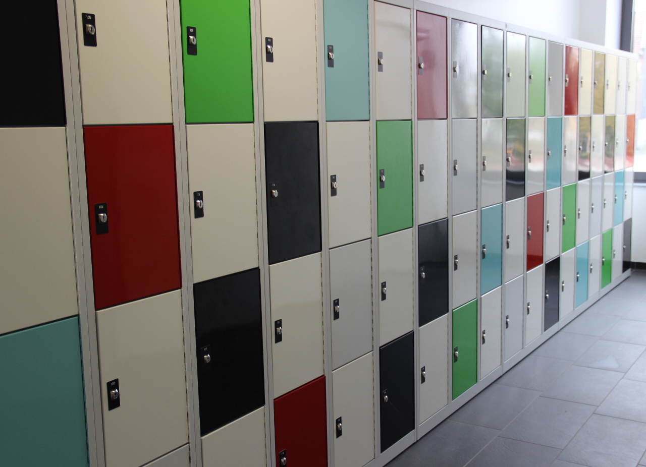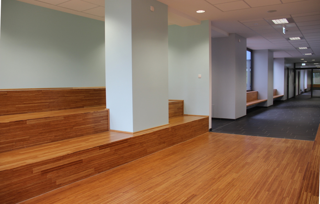 Für die Flexzonen in den Fluren wurden als räumlich und pädagogische Vorgabe Sitzstufenanlagen konzipiert, die die Nutzung der Zonen als Lerninsel, Ruhezone oder Pausenfläche ermöglichen und den Brandschutz erfüllen. Schließflächer, die mit dem Farbkonzept korrespondieren wurden vom Nutzer angeschaft.