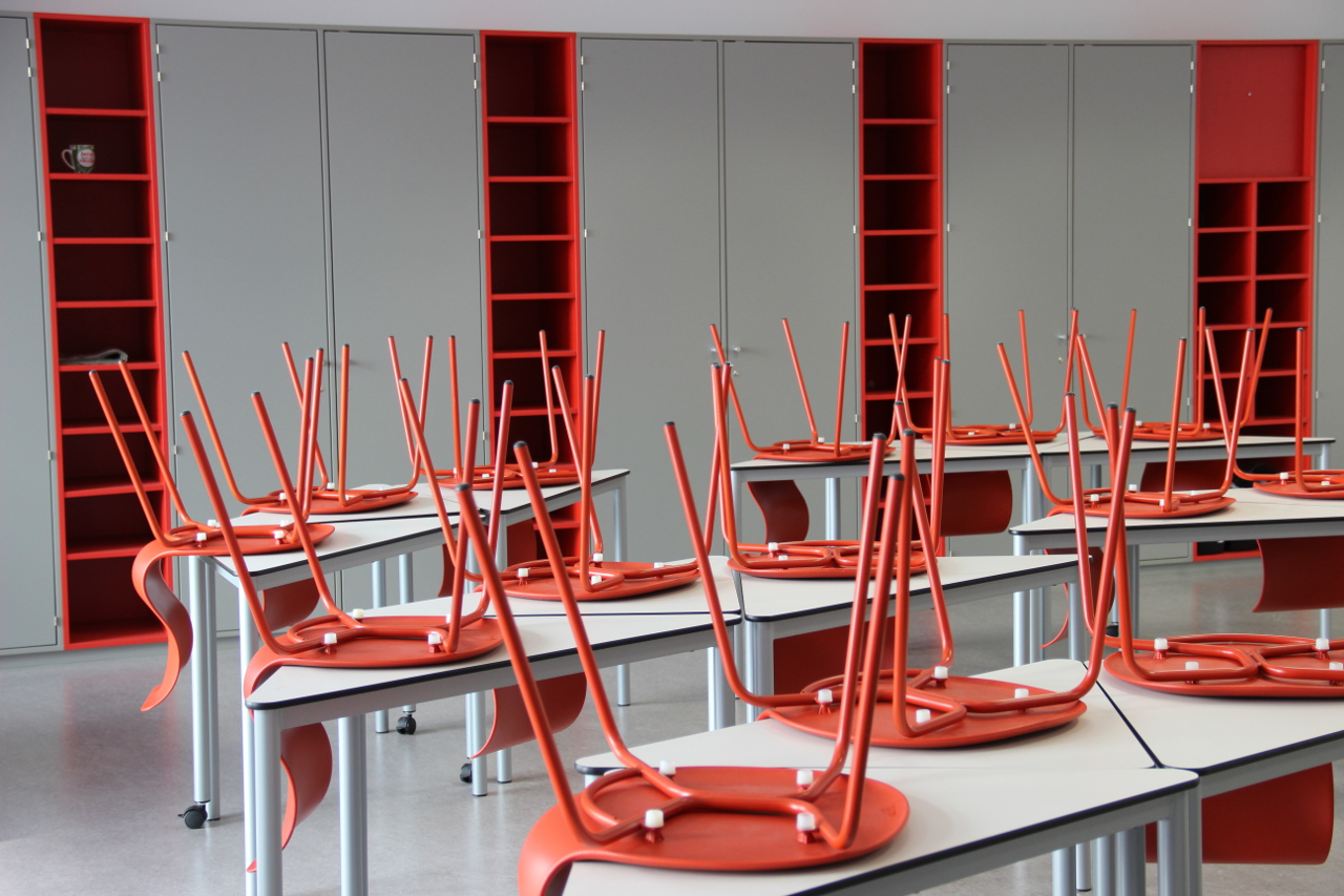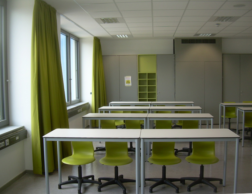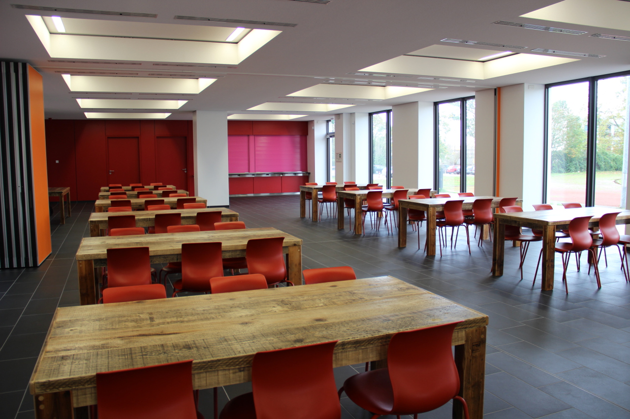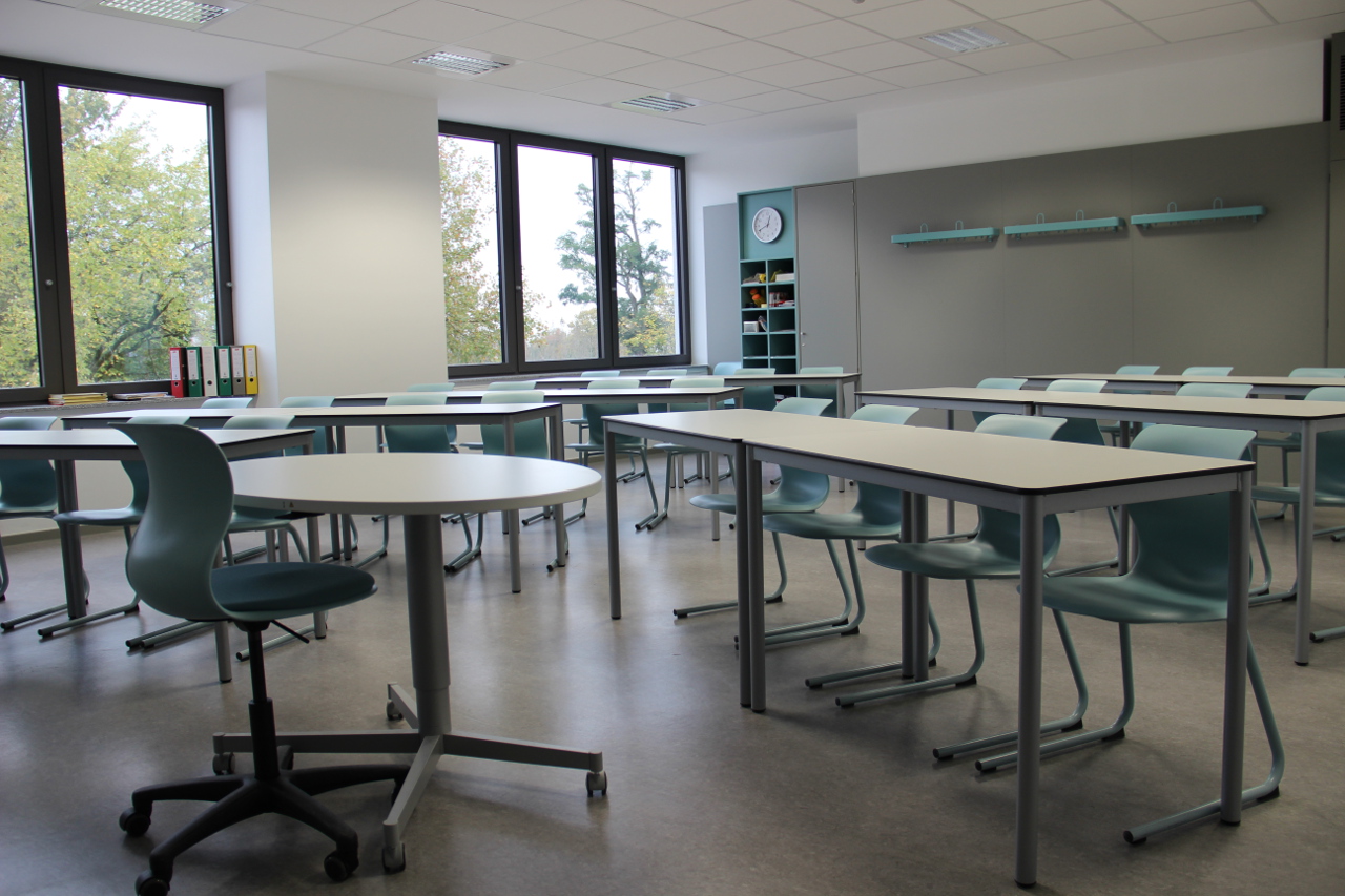 Für die Klassen, Flexklassen und Fachräume wurden Schranksysteme für das Lehrerraumprinzip erarbeitet. Die Einrichtung von Mensa und Schülerbibliothek wurde auf die Bedürfnisse von Schülern der Sek 1 zugeschnitten, u.a. mit Tischen aus recyceltem Bauholz und Sitzsäcken.