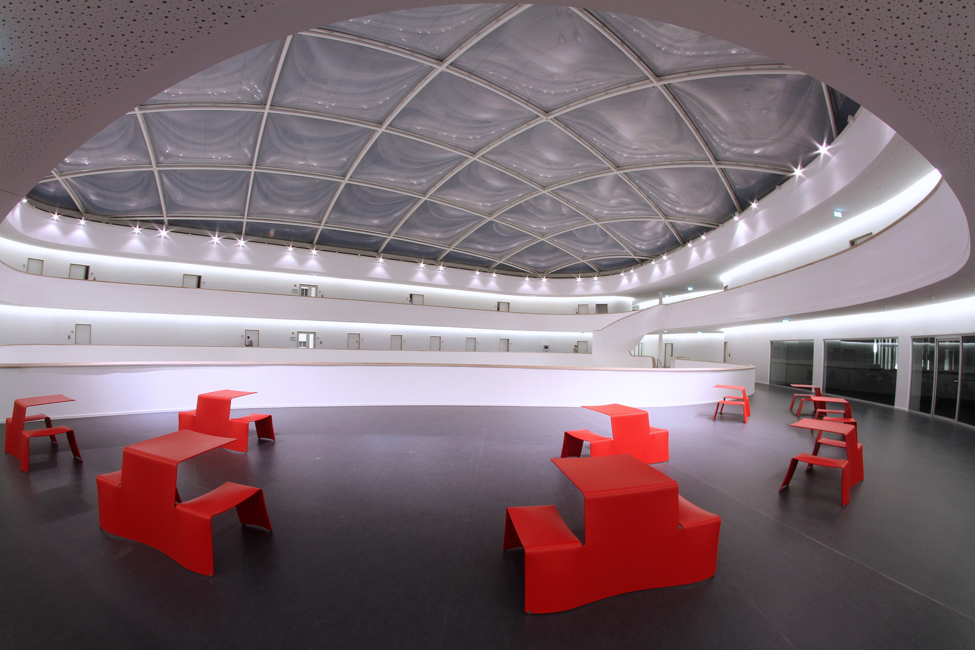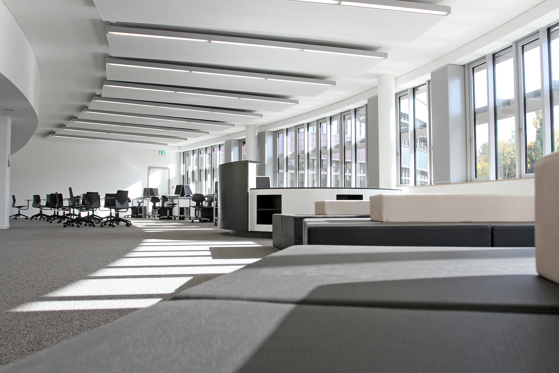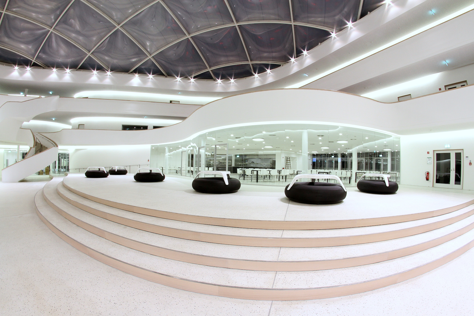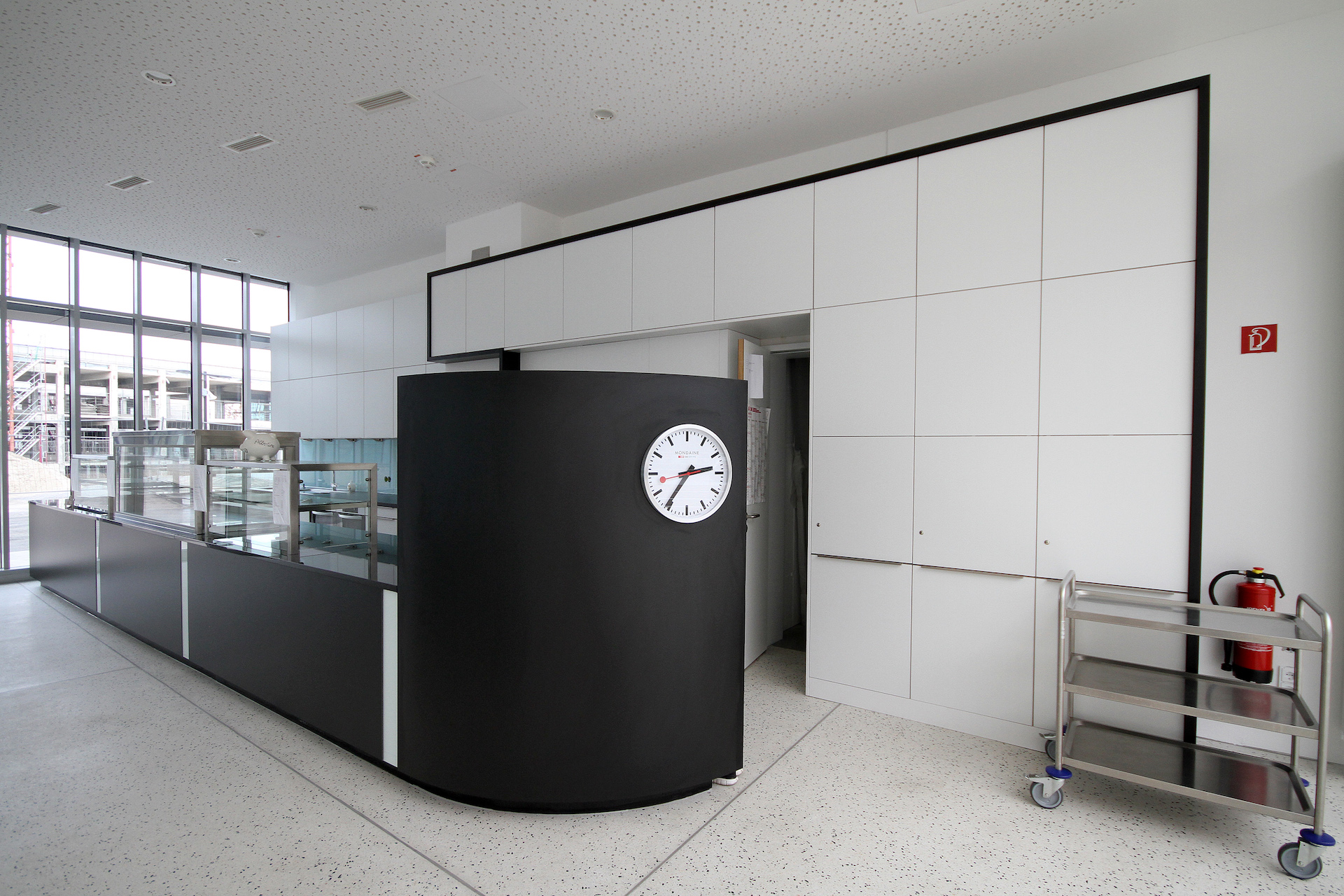 Der Architektur des Gebäudes folgend, ist die Innenausstattung entsprechend den vorgesehenen Nutzungen in Bauteil A als öffentliche Räume – die Begegnung fördernd – und in Bauteil B den Stammklassen - als Lernraum fördernd – geplant worden. Auf die intensiven Farben der Außenhülle reagiert die Inneneinrichtung des Gebäudes mit einer zurückhaltenden Farbwahl. Den Auftakt machen, beim Betreten des Gebäudes, im Lichtdurchfluteten Atrium die Sondermöbel, die in dem großzügigen Raum zum Verweilen einladen sollen. Alle Klassenräume werden in den Wandnischen entlang der gekrümmten Flurwand mit Einbaumöbeln ausgestattet. Hierin sind Klassenschrank, Garderobe, offene Schülerfächer und ein zusätzlicher Sitzplatz für separates Arbeiten integriert.