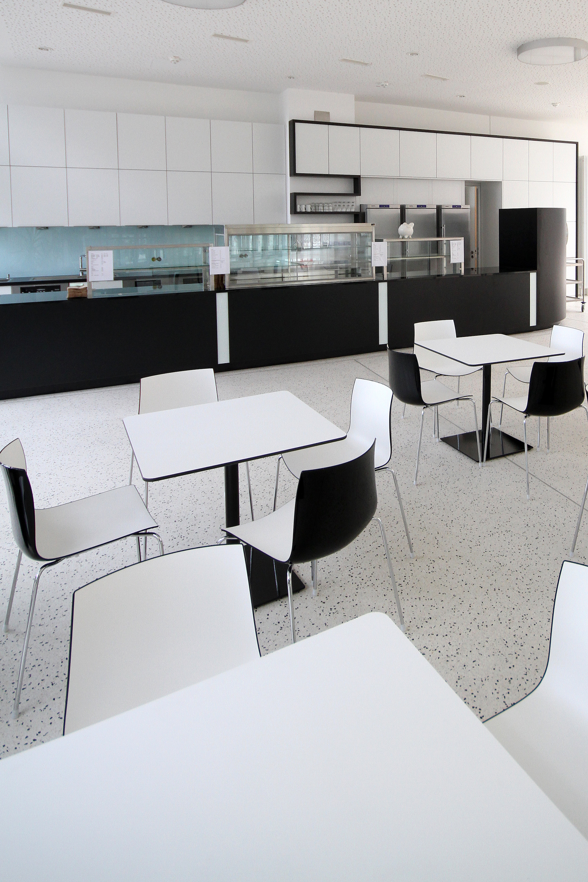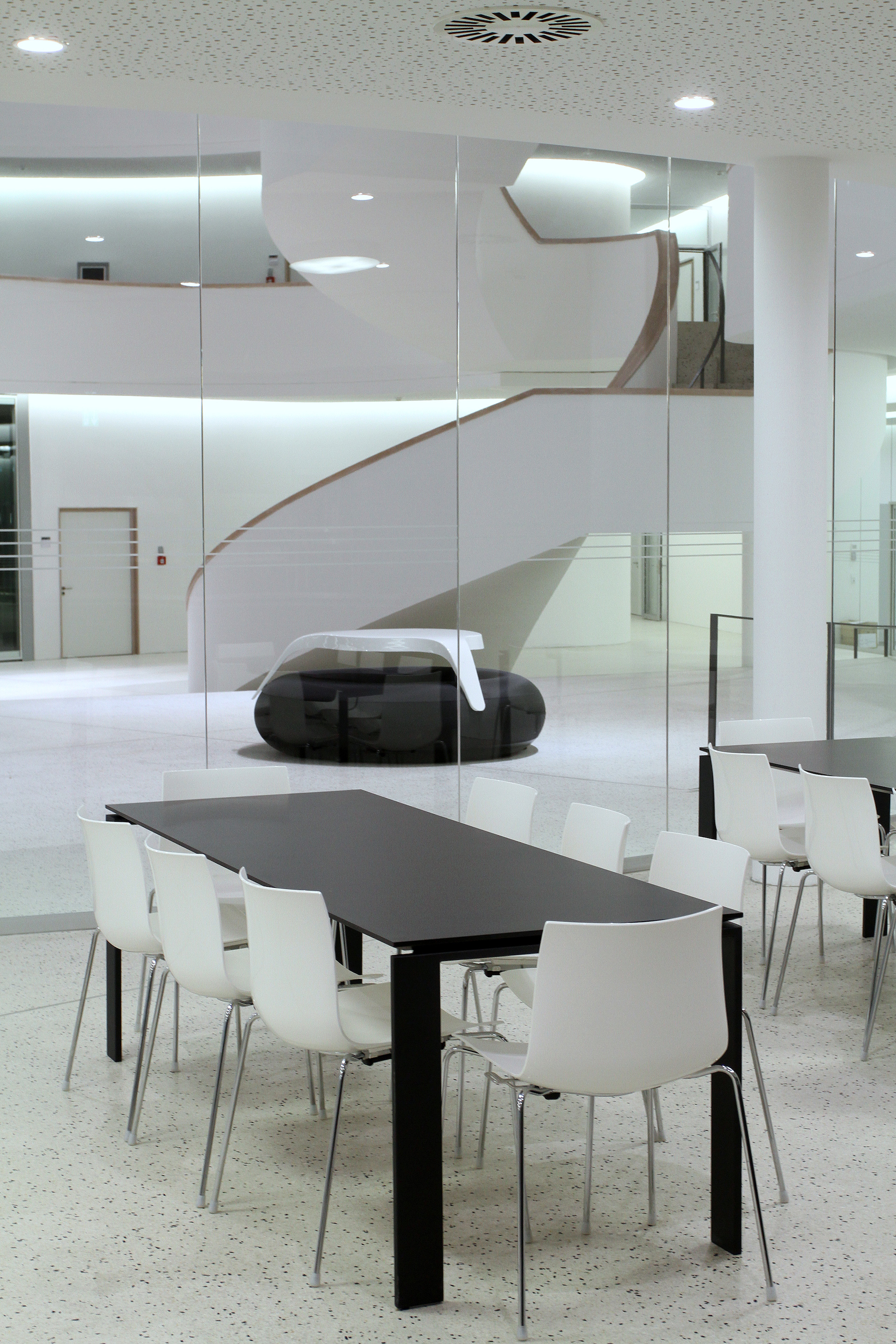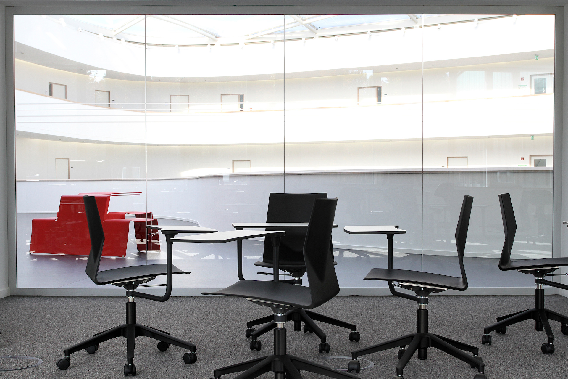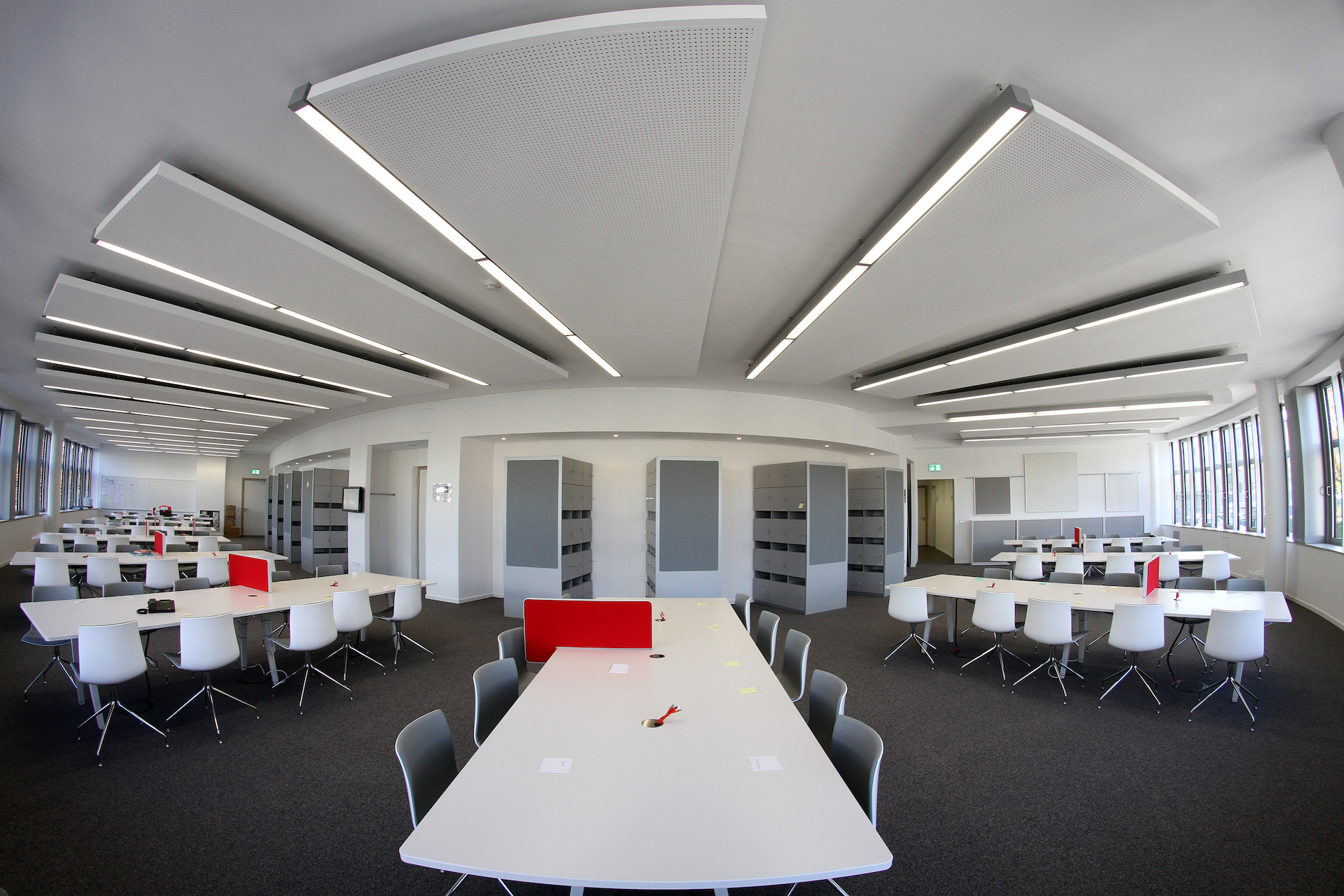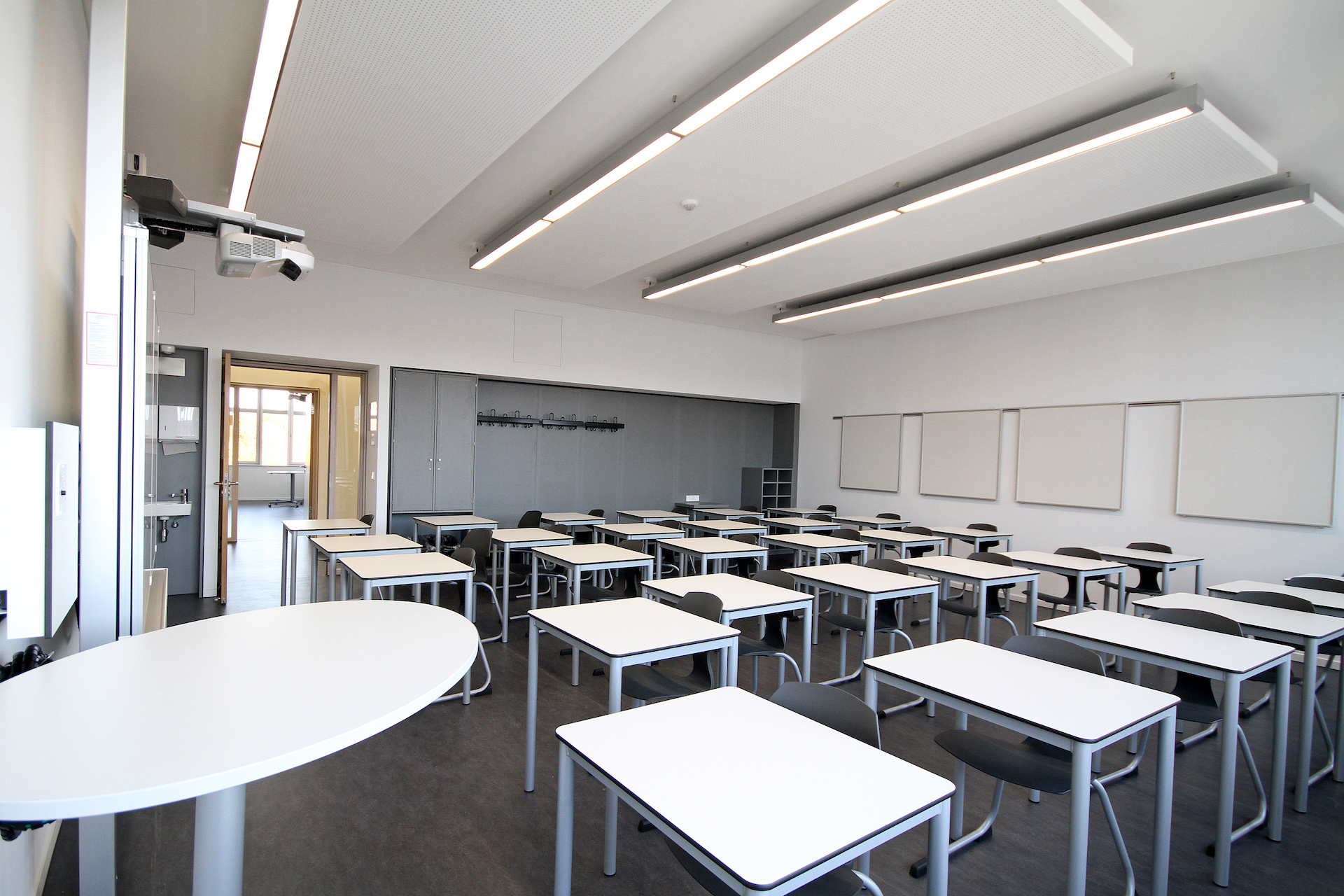 Die Einrichtung mit Digitalen Tafeln auf der einen Raumseite und Flexiblen Tafeln auf der Anderen, wird von einem mobilen, höhenverstellbaren Lehrertisch ergänzt, der dem Lehrer die Möglichkeit eröffnet aus dem frontalen Arbeiten heraus, das Möbel zu einem zentralen Tisch als Moderator oder auch des Beobachtenden aus einem rückseitigen Raumbereich zu bewegen.