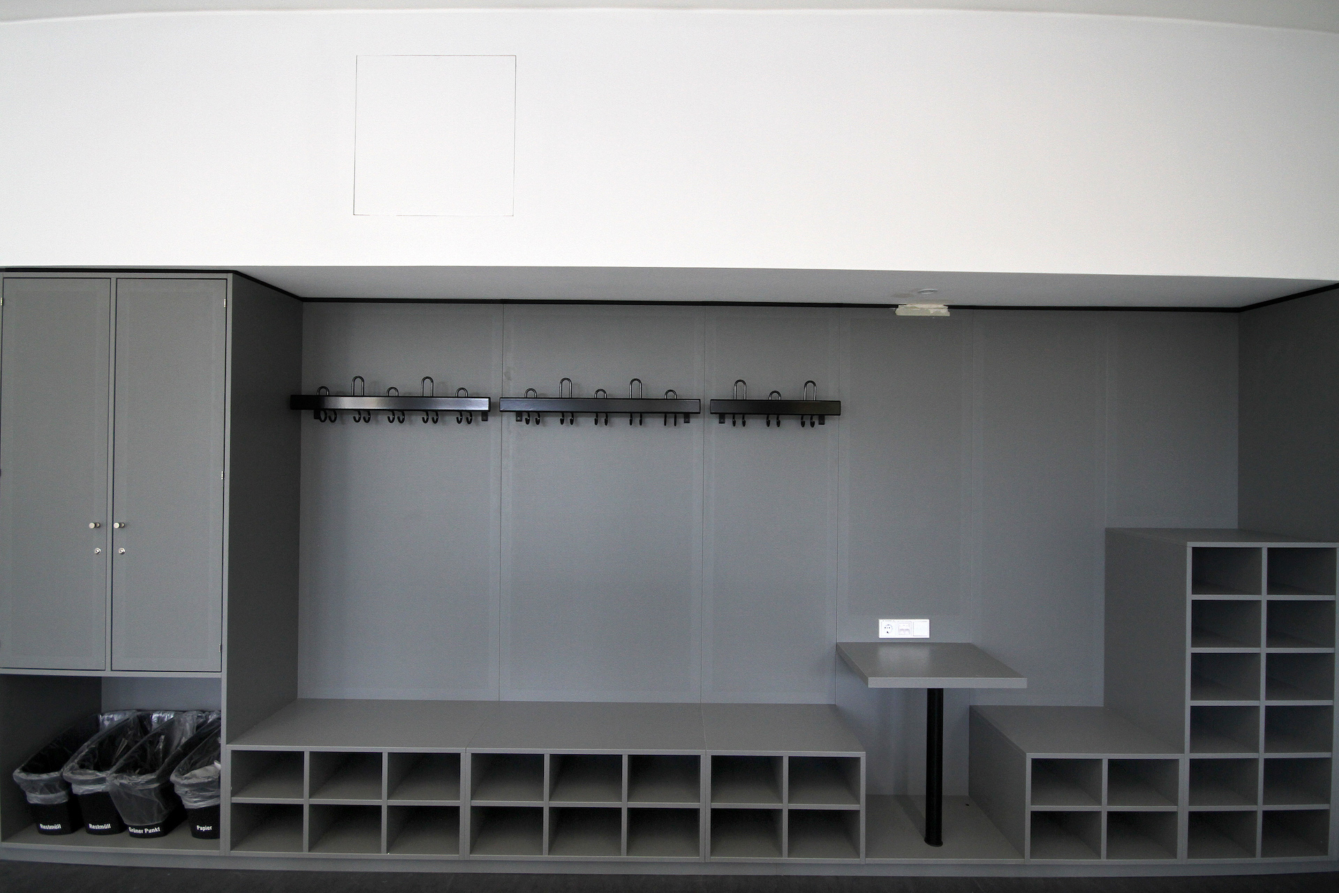 Für die Nischen wurde ein Systemmöbel entwickelt, bestehend aus vier Grundtypen, die sich, der Geometrie des Gebäudes folgend für jede Schranknische frei zusammenstellen lassen und trotz der Unterschiedlichkeit jeden Raumzuschnittes ein einheitliches Bild der Schrankzone vermitteln.