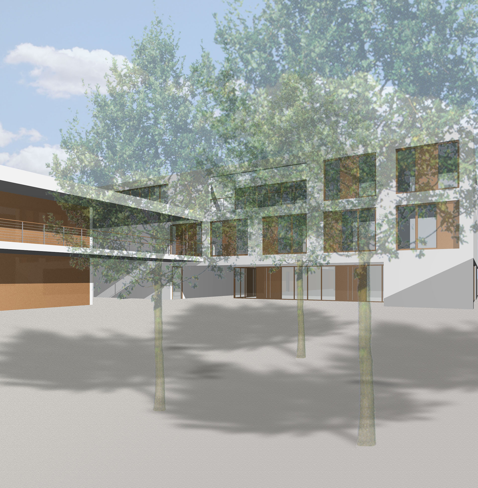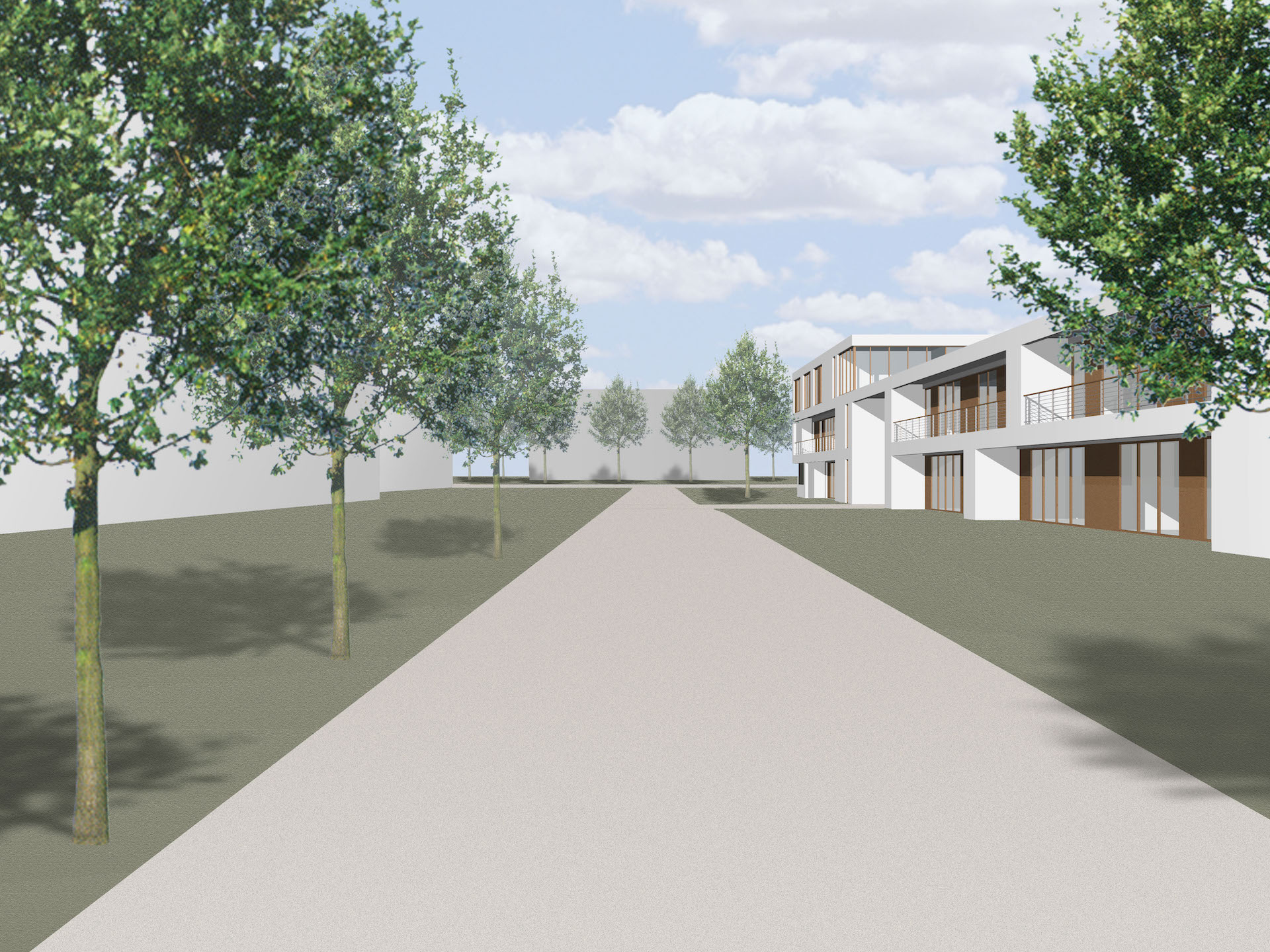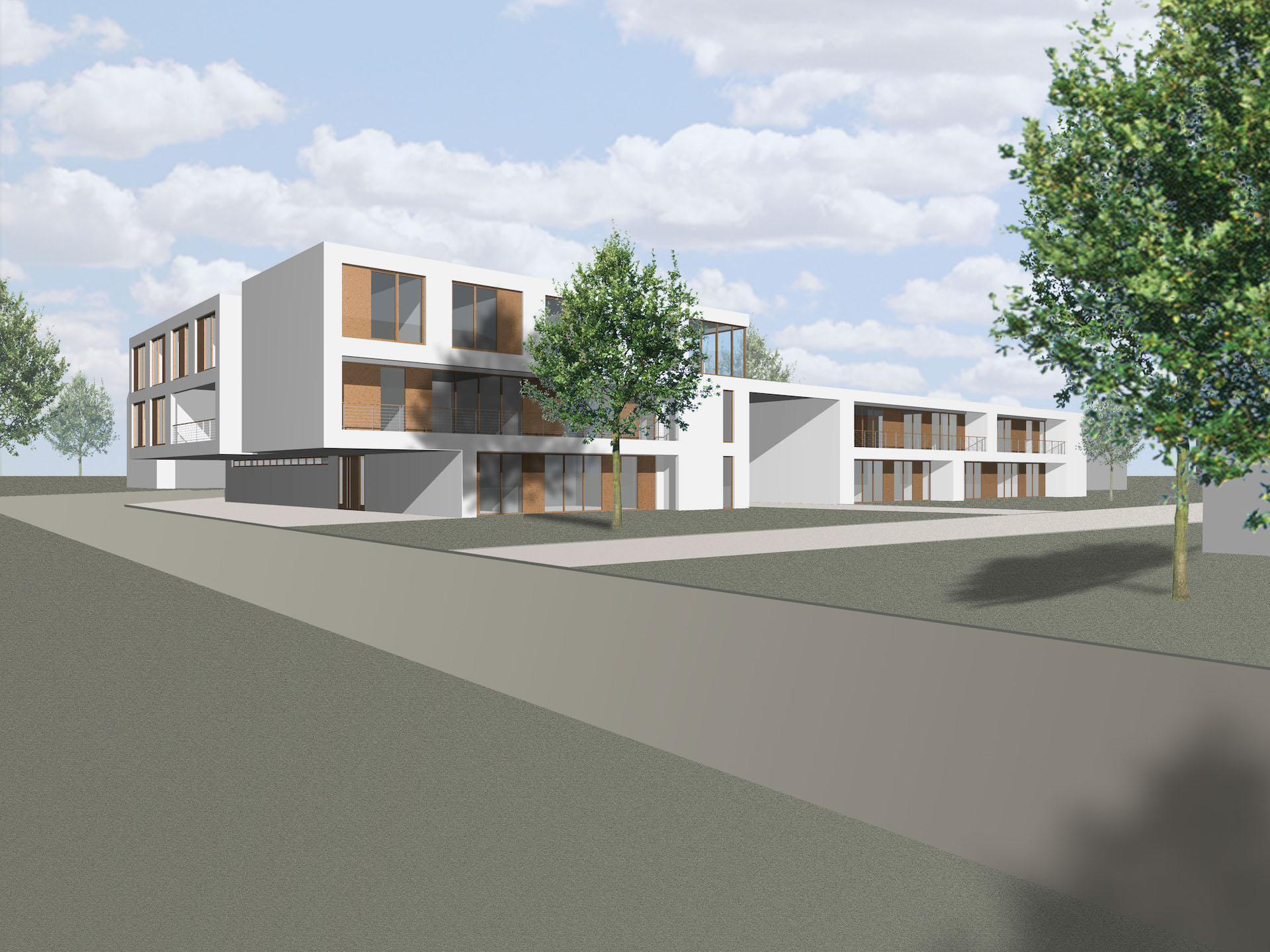 Das Haus für Senioren und Pflegebedürftige besteht aus vier, den Maßstab des Quatieres aufnehmenden Gebäudeteilen, die in Ihrer Ausformung zu einem Haus gebunden werden. Es ist von differenzierter Gestalt, mit intimen Wohnbereichen und Außenraumbezügen. Ein alle Gebäude bindender Vorplatz lädt den Ankommenden ein, er ist Ort des Verweilens, Ort für Feste, er ist der Mittelpunkt der Hausgemeinde. Im Erdgeschoss sind zum Platz hin der Gemeinschaftsbereich und der Pflegestützpunkt angeordnet, die Wohnungen orientieren sich zum Grünbereich. Alle Wohnungen im Haus (acht 2-3 Zi-Whg. und zwei Gruppenwohnungen 1x 6 / 1x 9 Appartements) sind barrierefrei bzw. rollstuhlgerecht ausgebildet.