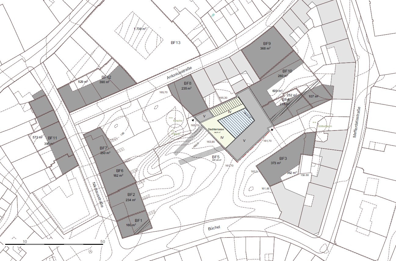 Das Baufeld „Wissen“ bildet das Zentrum für das neu zu schaffende Altstadtquartier Büchel in Aachen. Der historischen städtebaulichen Liniengebung folgend, wird die Blickbeziehung zum Aachener Dom mit der fußläufigen Ost-Westquerung aufgenommen. Die südwestliche Gebäudeecke ist von allen umliegenden Straßenbereichen sichtbar und bildet den einladenden, öffentlichen Eingangsbereich in das Gebäudes auf dem Baufeld „Wissen“aus. Die Verküpfung von Innen- Außenraum ist fließend und geht aus dem Gebäude-Zwischengeschoss in eine größzügige Außenterrasse in die „offene Wiese“ über. Hier könnte möglicherweise der Thermalzug in Form eines Brunnens öffentlich sichtbar gemacht werden. Durch zum Atrium hin gestaffelten, terrasenartig ausgeformten Büro- und Forschungsebenen reicht die natürliche Belichtung bis ins Erdgeschoss und schafft somit einen lichtdurchfluteten Mittelpunkt in der Eingangshalle (ARENA) mit mit vielfältigen Blickbeziehungen. Es ist Ort der Begegnung und Kommunikation.