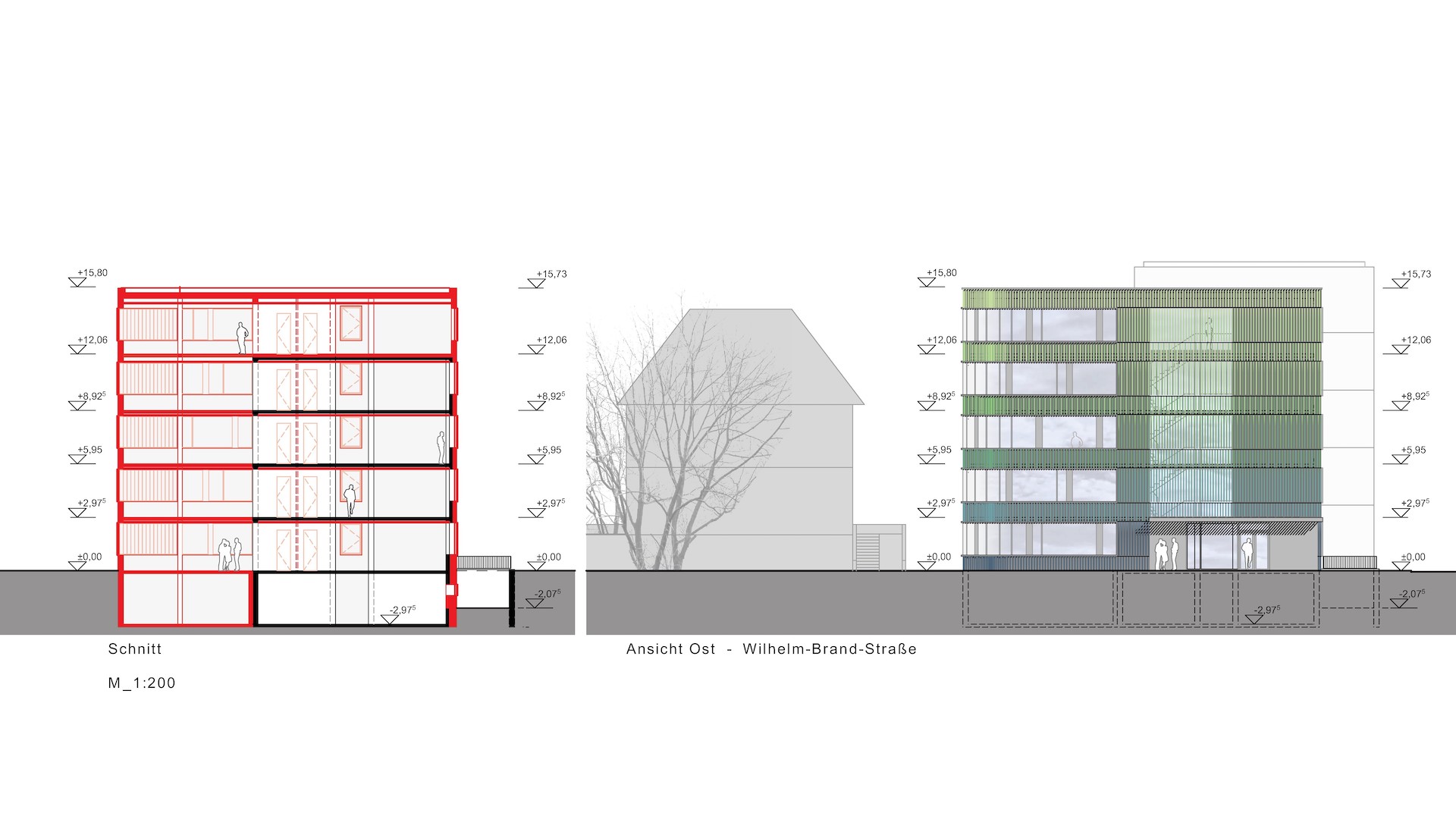 Ausgangssituation ist das viergeschossige Gebäude aus dem Baujahr 1959, mit einem zweigeschossigen Anbau. Aufgabe der Machbarkeitsstudie ist die Analyse und Bewertung des Gebäudes Wilhelm-Brand-Str. 1a, vor dem Hintergrund der gegebenen Bausubstanz zur Entscheidungsfindung, für eine energetische Sanierung des Gebäudebestandes und für einen Ersatzneubau unter wirtschaftlichen Aspekten. Neben der Betrachtung der zulässigen Grundstücksausnutzung gem. Bebauungsplan InO 219 aus dem Jahr 2005 wird in der Machbarkeitsstudie ebenfalls die Option für ein deutlich höheres Bauwerk mit maximaler Ausnutzung geprüft.