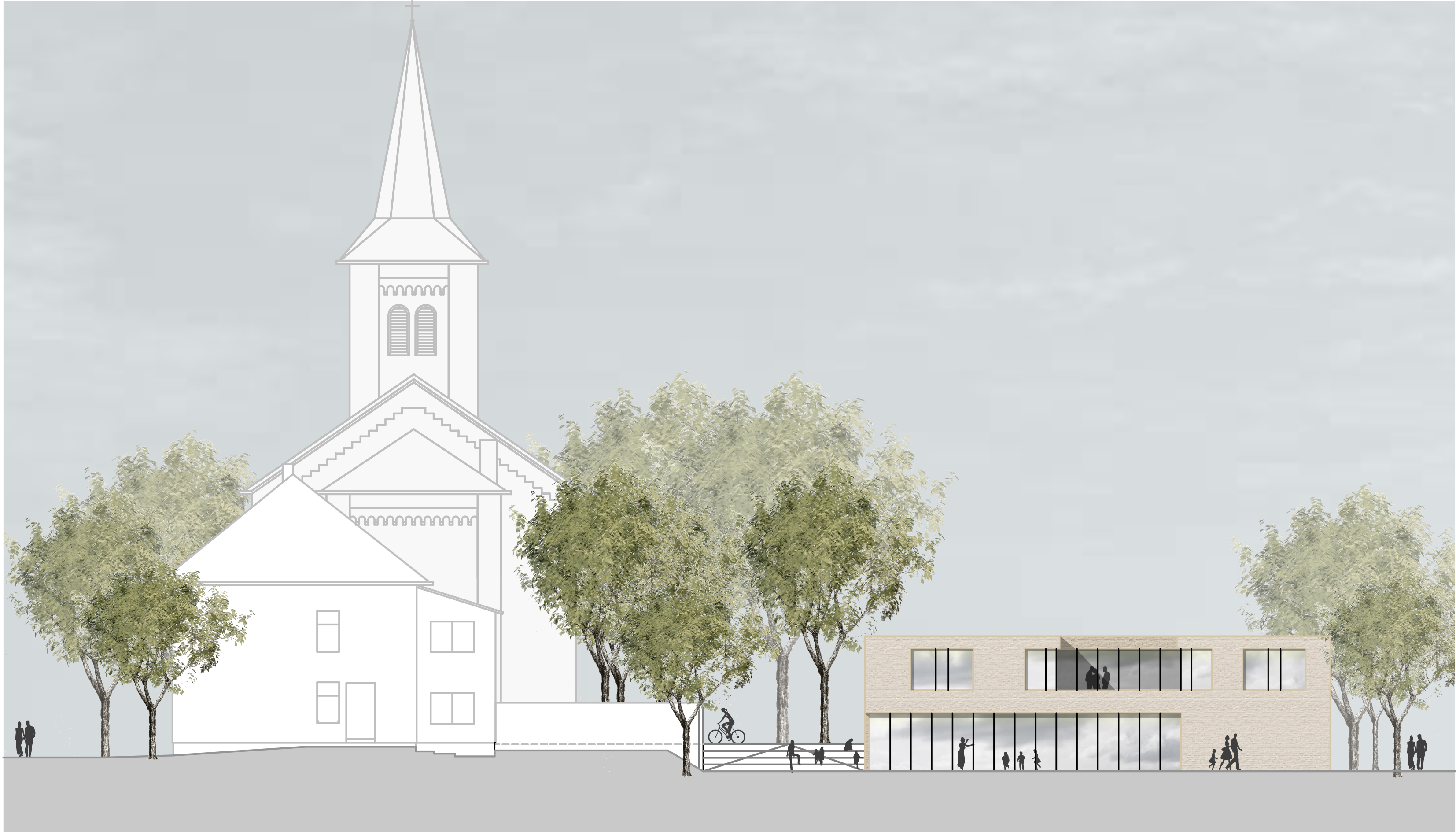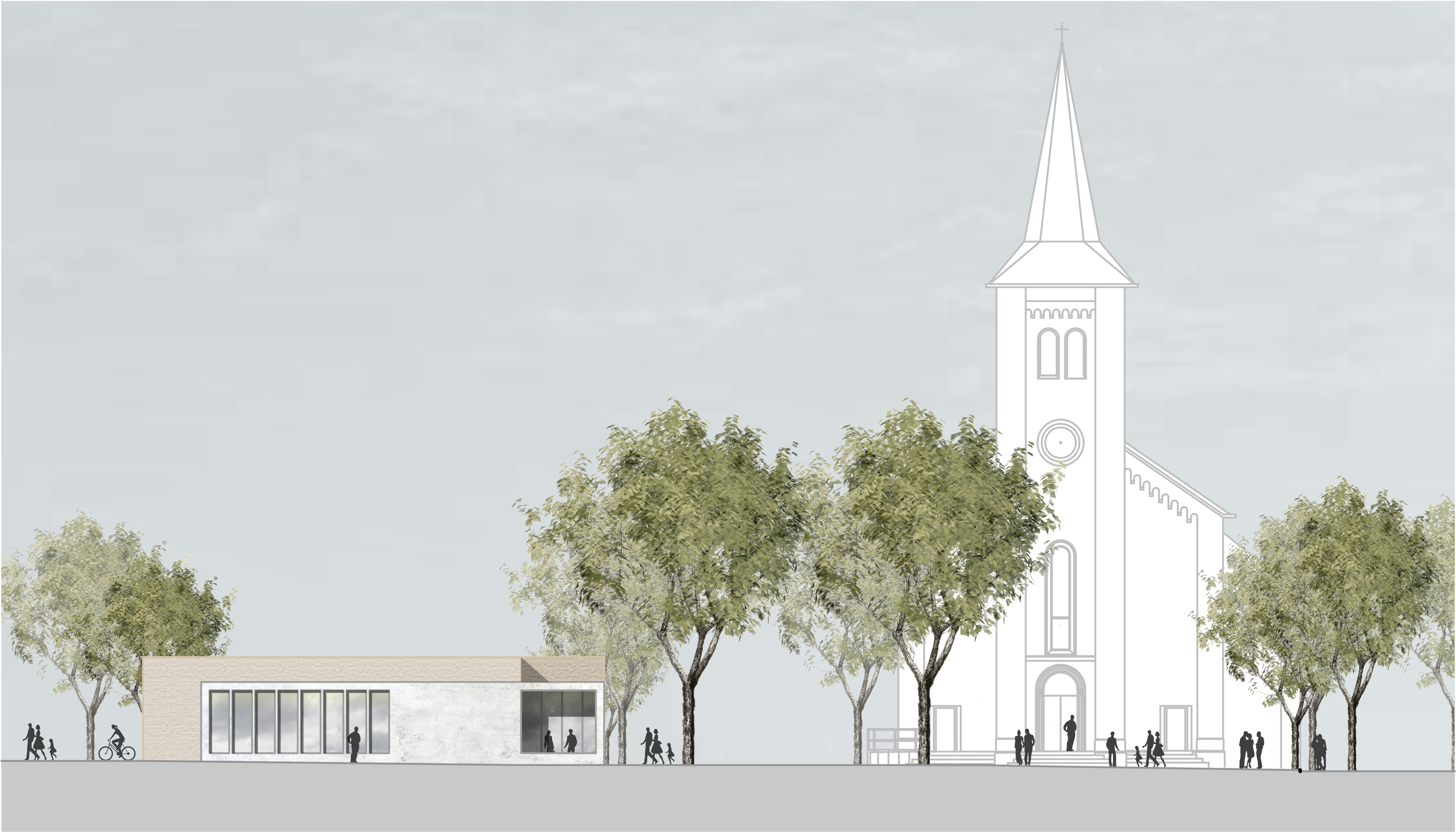 Das neue Gemeindehaus wird auf dem östlichen Grundstücksareal, nahe zum Niklaus-Groß-Platz hin situiert. Zusammen mit der Kirche und dem ehemaligen Pfarrhaus arrondiert es den Gemeindebereich zu einem städtebaulichen Ensemble mit einem zentralen Gemeindeplatz. Die in der Ausrichtung und im Charakter unterschiedlich gestalteten Außenbereiche Platz und Garten differenzieren zwischen öffentlichen und privaten Nutzungsbereiche. Der Kinderspielbereich wird in den Gemeindegarten einbezogen und somit in das Gemeindeleben integriert.