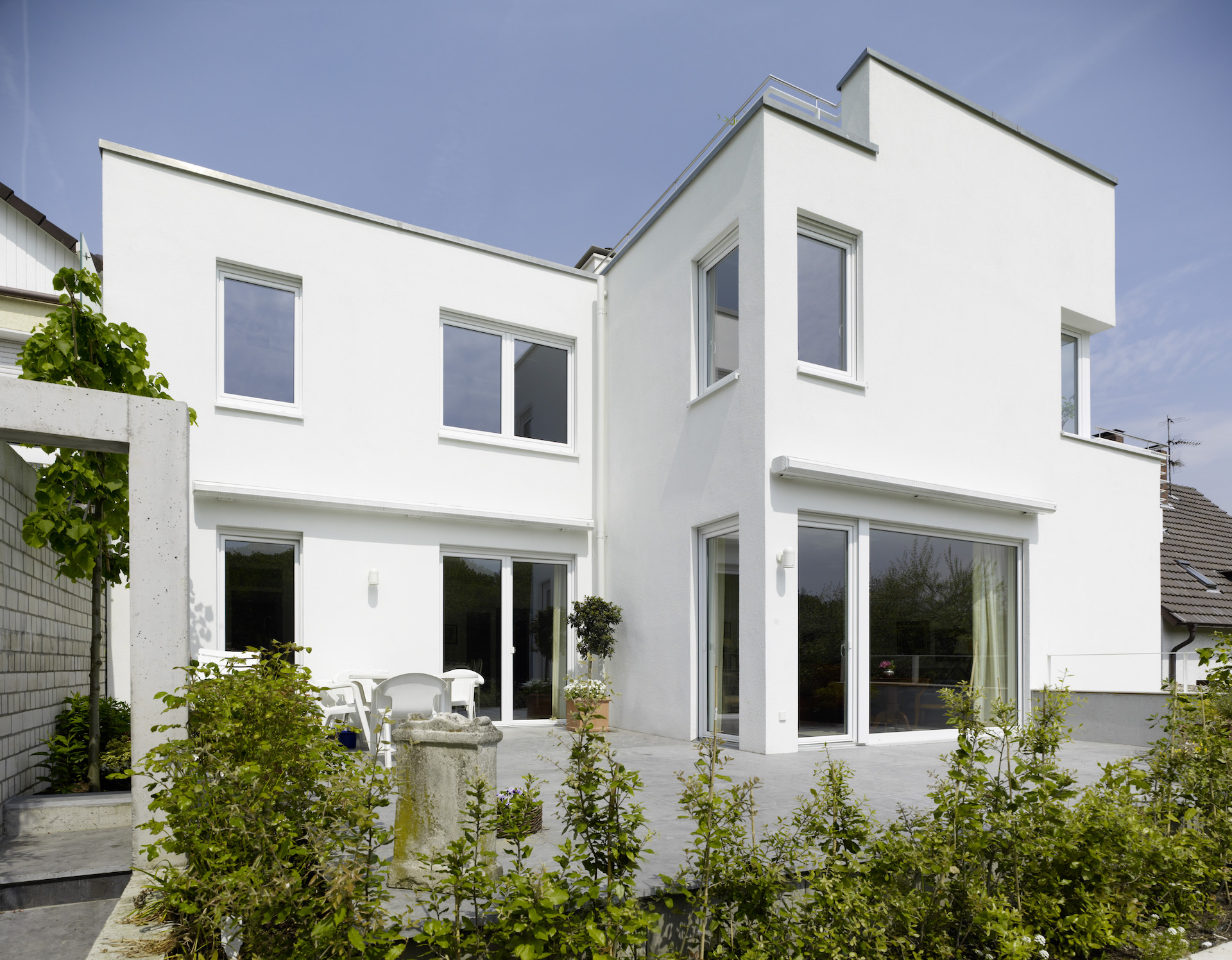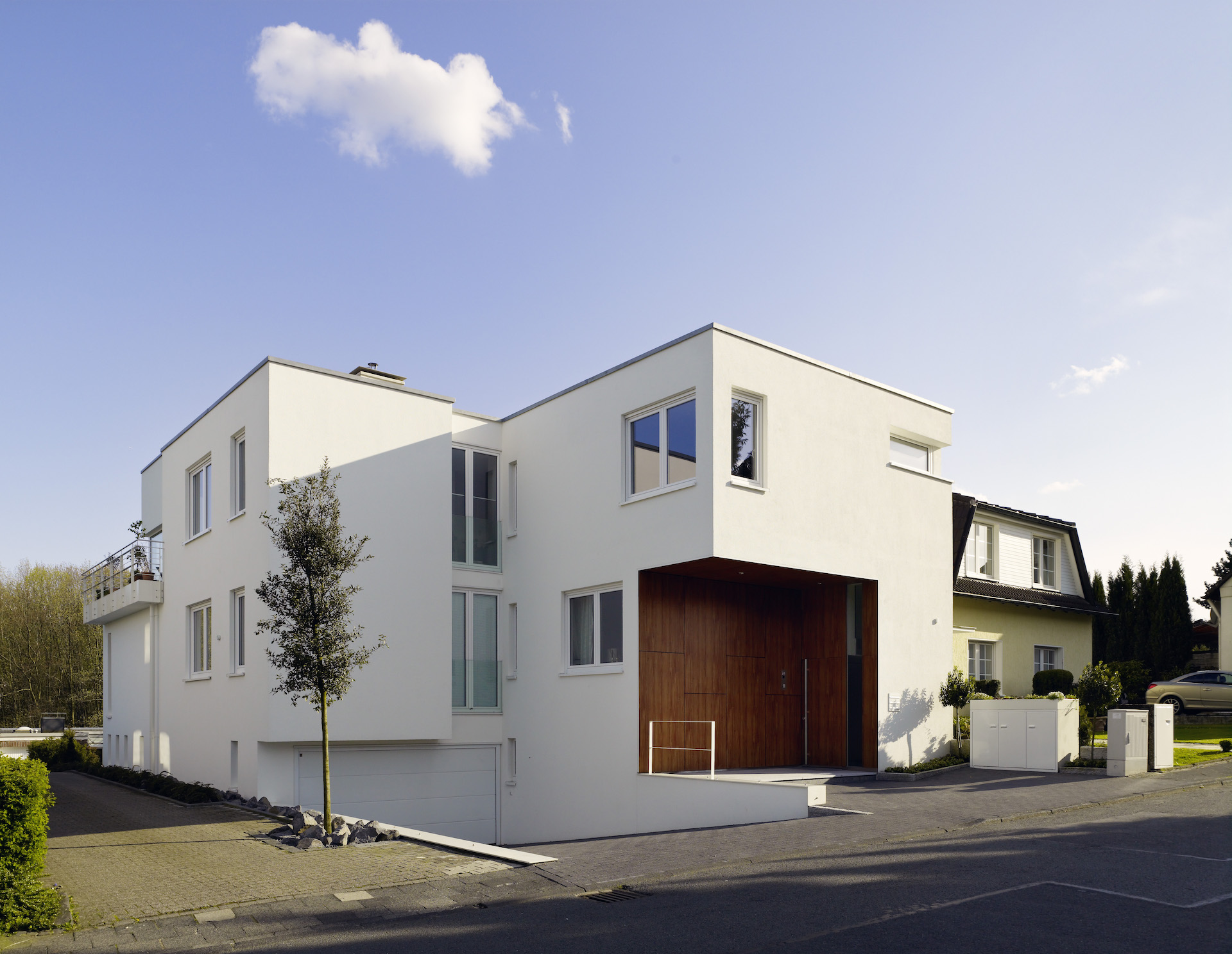 Die Gestalt des Hauses beruht auf der Idee die Wohneinheiten als Geschosswohnungen zu errichten, anstatt eines Doppel- oder Reihenhauses. Auf zwei Ebenen werden großzügig geschnittene barrierefreie Wohnungen von je ca. 150 qm geschaffen, die unterschiedliche Lebensformen zulassen. Die Erdgeschosswohnung wird über eine Gartenterrasse mit dem Garten (und der dazu gehörenden Arbeit) verbundenen. Die Wohnung im 1.OG verfügt über einen Balkon mit Aufgang zur Dachterrasse, die einen sehr geschützten Freibereich, der Ausblick bis zur Uni Bochum bietet.