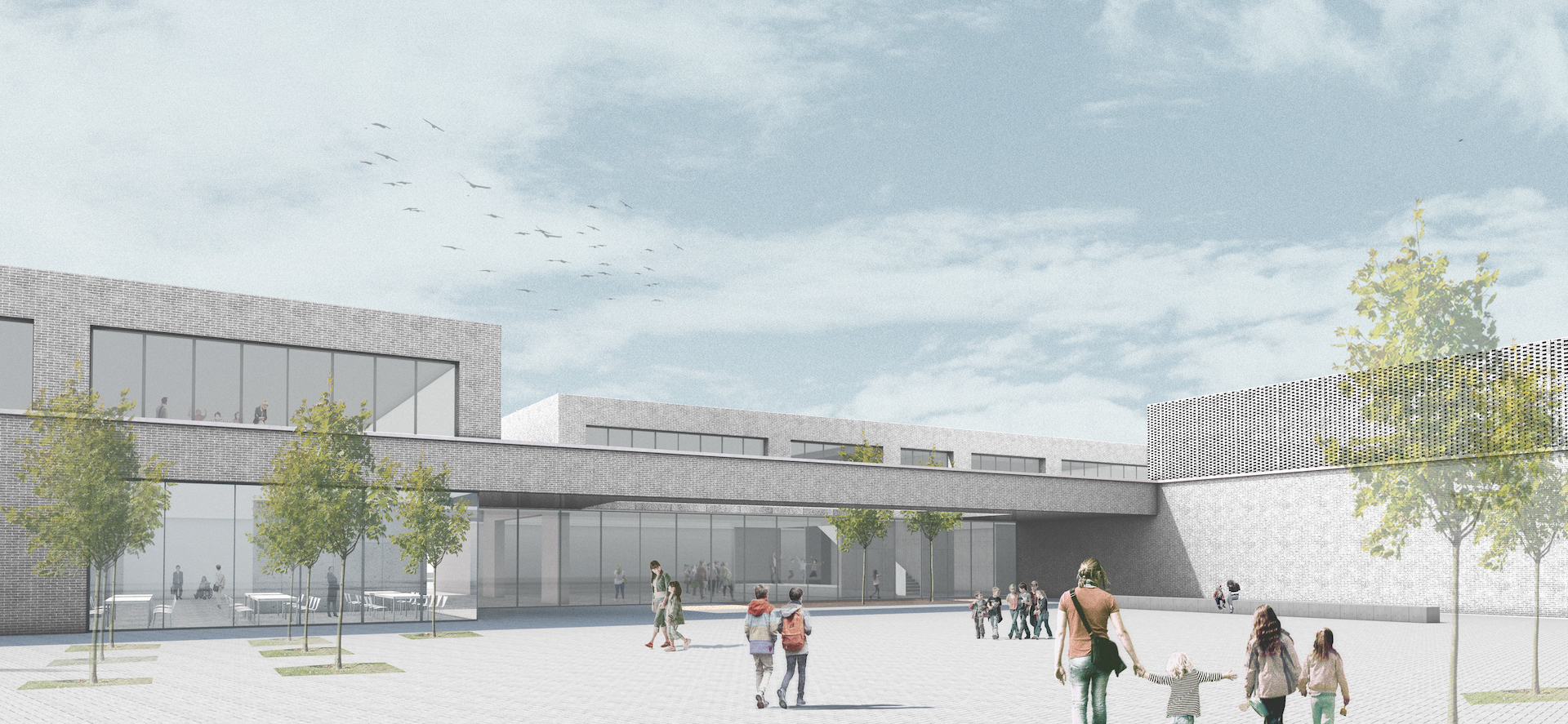 Das Leitbild für das neue Quartier wird durch den vorhandenen Baumbestand auf dem ehemaligen Schulgelände geprägt und wird zum „Wohnen im Park“ städtebaulich entwickelt. Die neue Schulanlage ist in die mit Bäumen umgebende Grünfläche eingebettet und wird mit dem Zugang zur Schule und den Sportbereichen von der Hervester Straße erschlossen. Die differenzierte Gebäudefigur mit einem überdachten Eingangsbereich sorgt für eine deutliche Adressbildung der Schule im Stadtteil. Das neue Schulhaus besteht aus einem eingeschossigen Hauptgebäude - ähnlich einer Basis - mit im ersten Obergeschoss aufgesetzten Kuben, die als Jahrgangsteams ausgebildet sind. Durch die Gliederung des Gebäudevolumens in einen Sockel mit Attikahäusern wird das Ensemble zu Einem gefasst und dabei differenziert ausgeformt. Die Ausbildung der ablesbaren Jahrgangshäuser trägt zur Wiedererkennung und zur Identifizierung der Schüler mit ihren Teams bei. Das Umfeld des Schulhofs ist als extensive Landschaftsrasenfläche angelegt. In diese sind Felder mit Wildblumenwiesen und die bestehenden Bäume integriert. Durch die Setzung von Findlingen und Bäumen werden zudem besondere Orte definiert.
