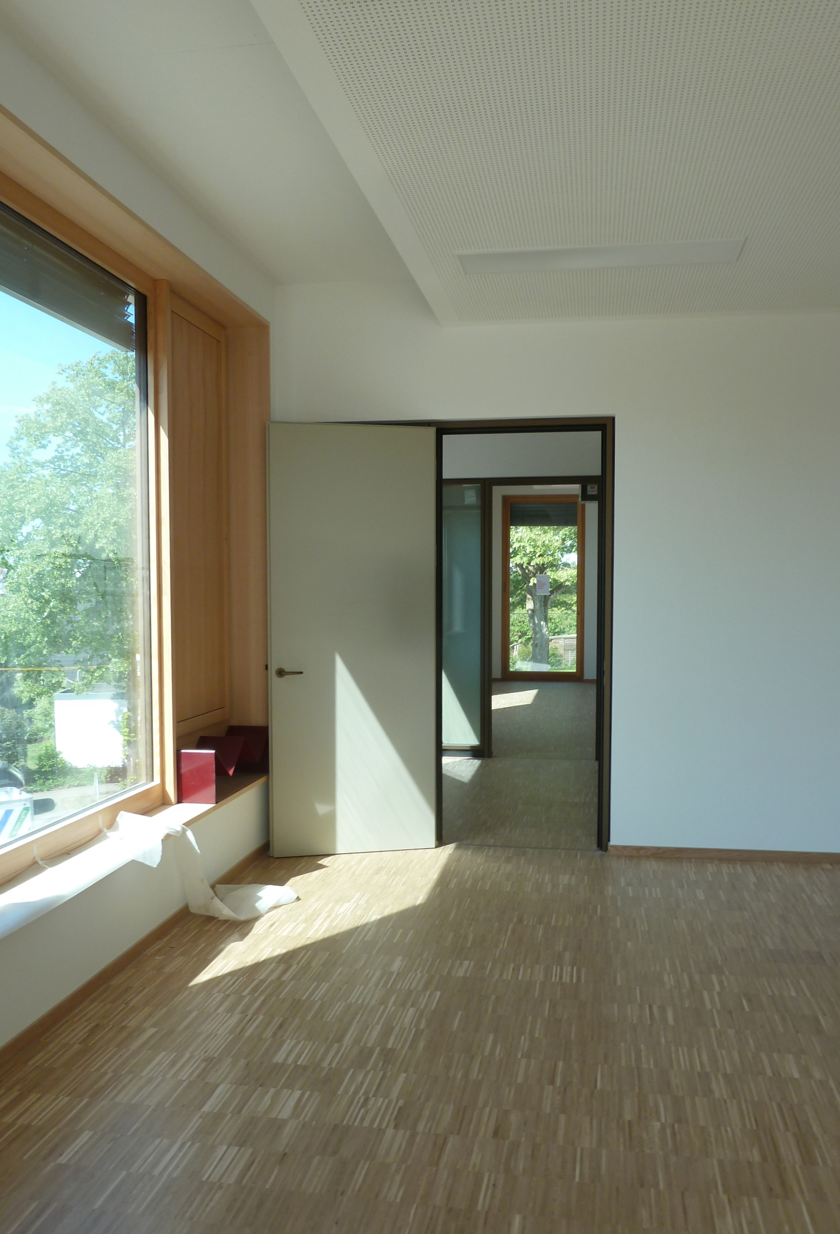 Durch das Gefälle im Gelände des Baufeldes mit ca. drei Metern in Nord-Südrichtung wird ein Hanggeschoss entwickelt, welches die Durchwegung des Gebäudes vom Vorplatz an der Kreuzung bis zum Schulhof im Erdgeschoss über eine offene lichtdurchflutete dreigeschossige Halle ermöglicht.