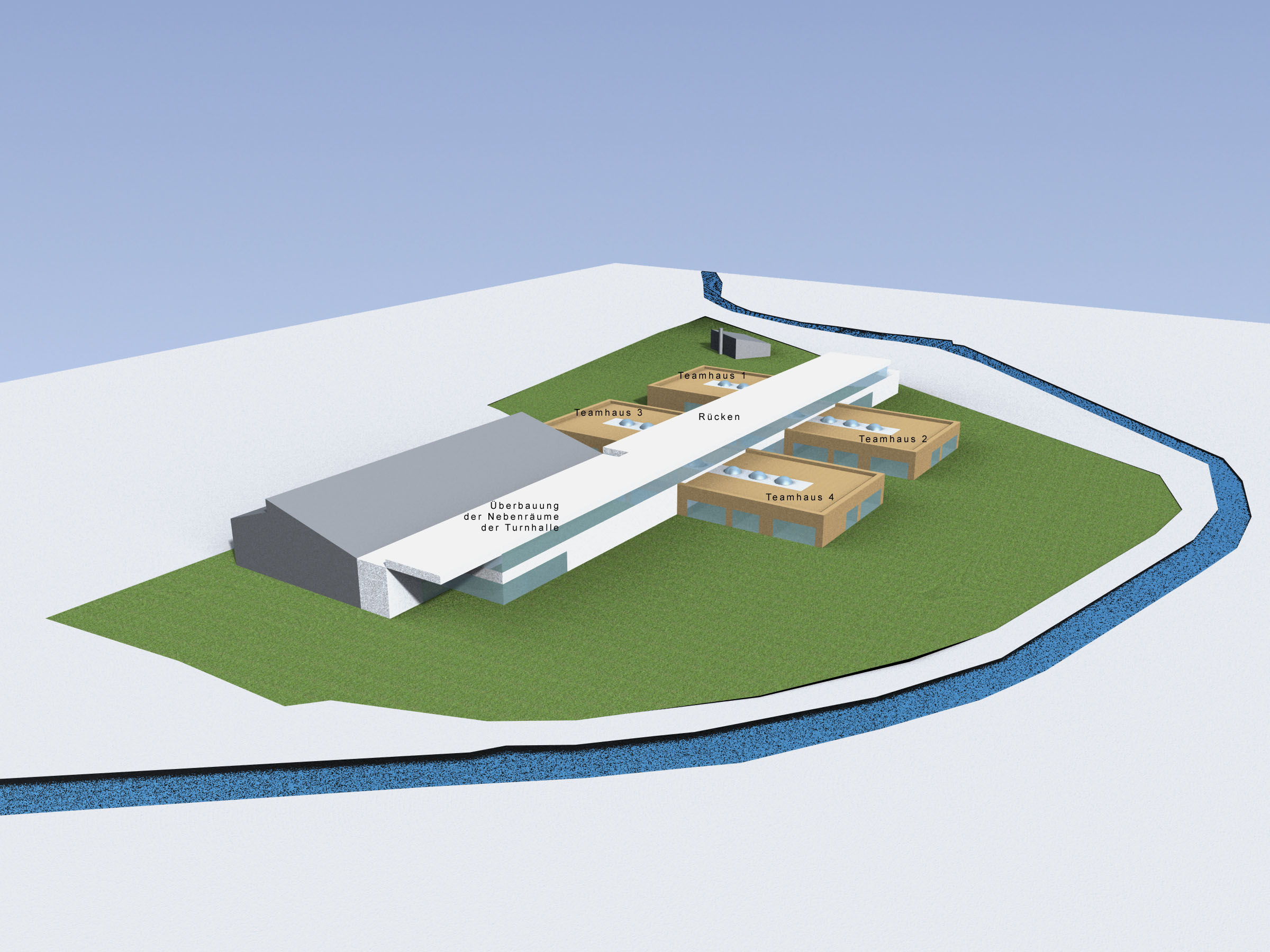 Die Zonierung der Freiflächen zum Fluss und zur Landschaft wurde mit allen Beteiligten und den Landschaftsarchitekten erarbeitet und der externe Zugang der bestehenden Sporthalle (direkter Anschluss an den Neubau) mit den Sportvereinen abgestimmt.