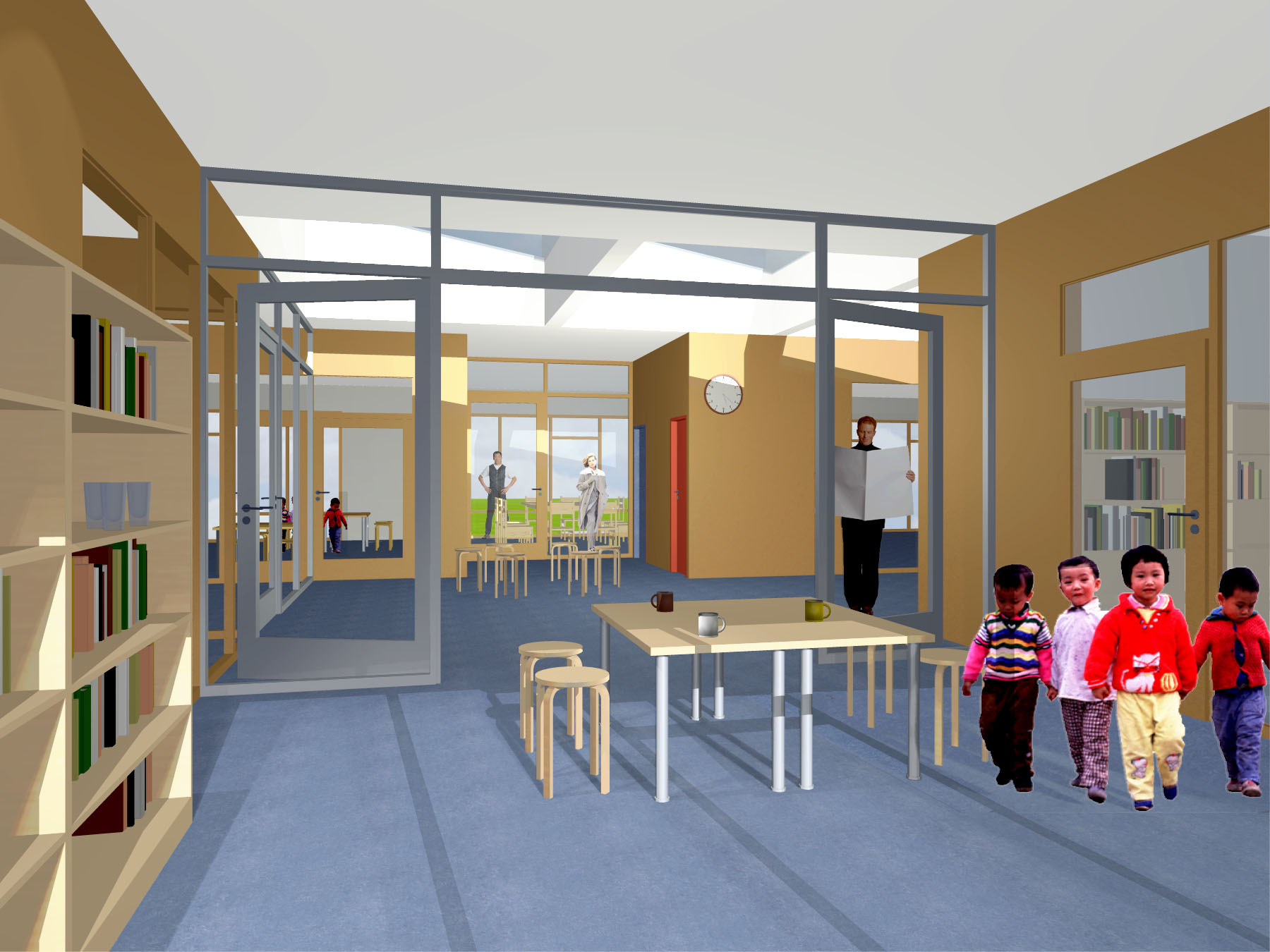 Das komplette Raumprogramm für die zukünftig vierzügige Grundschule mit Ganztagsbereich wurde gemeinsam von Architekten, Nutzern und Verwaltung im Rahmen des VOF-Verfahrens erarbeitet. Durch die Vorgabe der Thematik zur „fraktalen Schule“ und Besichtigung von Schulneubauten vor Planungsbeginn, wurden die Wünsche und Ideen für den zu planenden Neubau formuliert. Die räumlichen und pädagogischen Vorgaben wurden in Gesprächsrunden (heute als Phase 0 – Workshop bezeichnet) diskutiert und bis zum Entwurf der vierzügigen Grundschule konkretisiert. Das Zentrum der Schule mit abgesenkter Sitzstufenanlage ist als gemeinsamer Ort für die Schulgemeinde und Ausgangspunkt für die Raumstruktur.