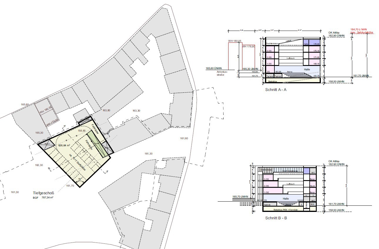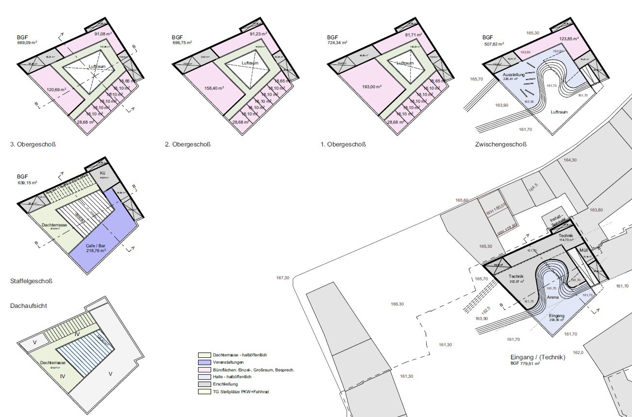 Das Baufeld „Wissen“ bildet das Zentrum für das neu zu schaffende Altstadtquartier Büchel in Aachen. Der historischen städtebaulichen Liniengebung folgend, wird die Blickbeziehung zum Aachener Dom mit der fußläufigen Ost-Westquerung aufgenommen. Die südwestliche Gebäudeecke ist von allen umliegenden Straßenbereichen sichtbar und bildet den einladenden, öffentlichen Eingangsbereich in das Gebäudes auf dem Baufeld „Wissen“aus. Die Verküpfung von Innen- Außenraum ist fließend und geht aus dem Gebäude-Zwischengeschoss in eine größzügige Außenterrasse in die „offene Wiese“ über. Hier könnte möglicherweise der Thermalzug in Form eines Brunnens öffentlich sichtbar gemacht werden. Durch zum Atrium hin gestaffelten, terrasenartig ausgeformten Büro- und Forschungsebenen reicht die natürliche Belichtung bis ins Erdgeschoss und schafft somit einen lichtdurchfluteten Mittelpunkt in der Eingangshalle (ARENA) mit mit vielfältigen Blickbeziehungen. Es ist Ort der Begegnung und Kommunikation.