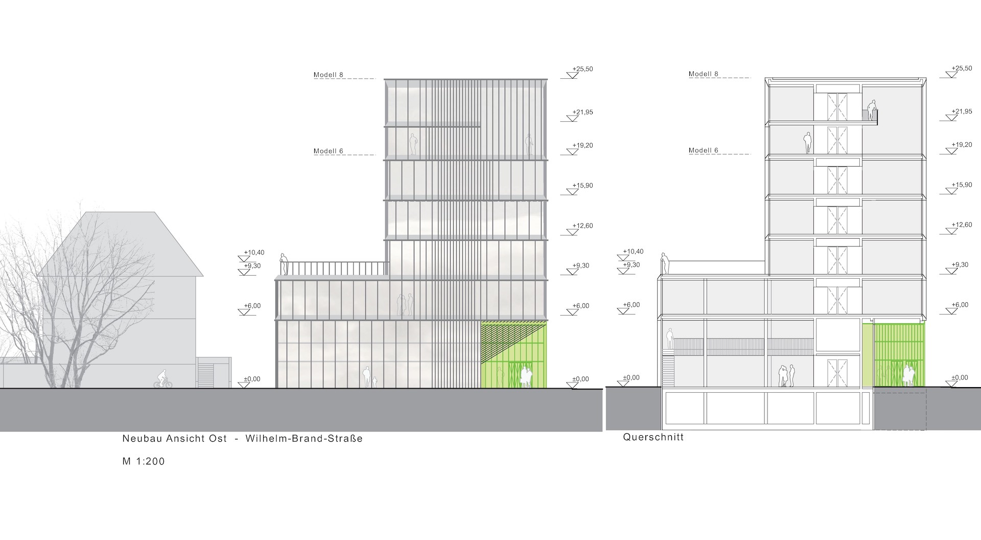 Ausgangssituation ist das viergeschossige Gebäude aus dem Baujahr 1959, mit einem zweigeschossigen Anbau. Aufgabe der Machbarkeitsstudie ist die Analyse und Bewertung des Gebäudes Wilhelm-Brand-Str. 1a, vor dem Hintergrund der gegebenen Bausubstanz zur Entscheidungsfindung, für eine energetische Sanierung des Gebäudebestandes und für einen Ersatzneubau unter wirtschaftlichen Aspekten. Neben der Betrachtung der zulässigen Grundstücksausnutzung gem. Bebauungsplan InO 219 aus dem Jahr 2005 wird in der Machbarkeitsstudie ebenfalls die Option für ein deutlich höheres Bauwerk mit maximaler Ausnutzung geprüft.