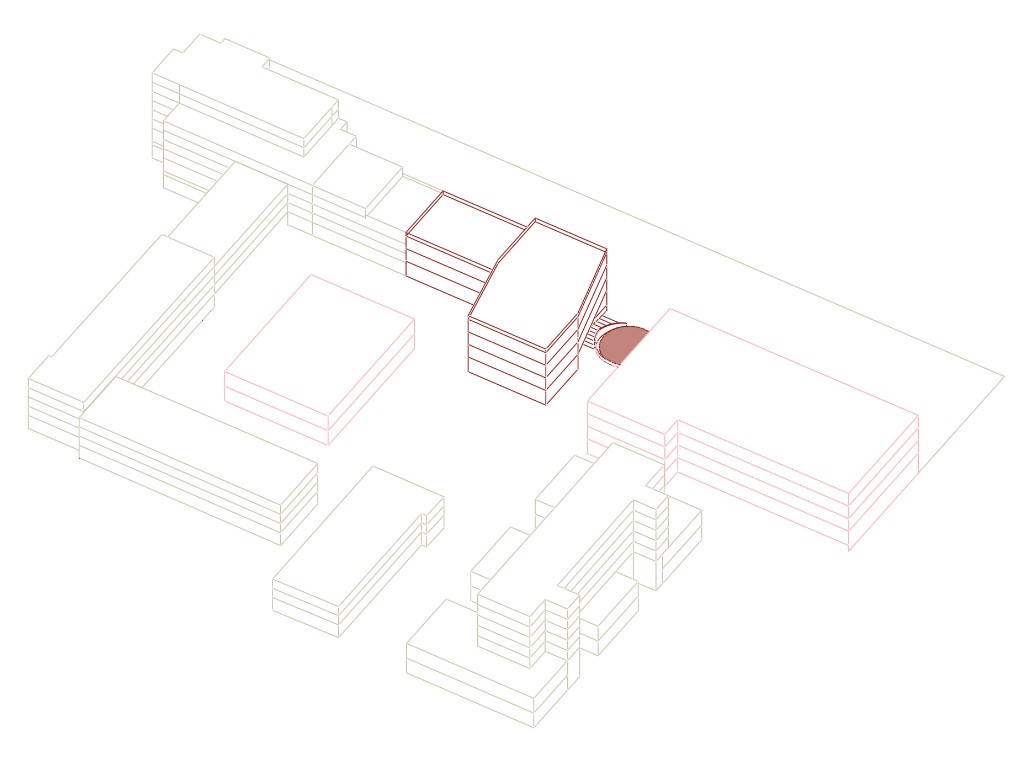 Durch die diagonale Verschränkung der Gebäudefigur wird der Zugang zwischen dem Platzneubau und dem Gesundheitszentrum zum südlichen Bereich des Kurt-Schumacher-Platzes geöffnet. Auf der Westseite schafft die diagonale Verschränkung einen gebührenden Abstand zum Bodendenkmal Burgfried und öffnet den Zugang von der bzw. zur Konrad Adenauer Straße.
