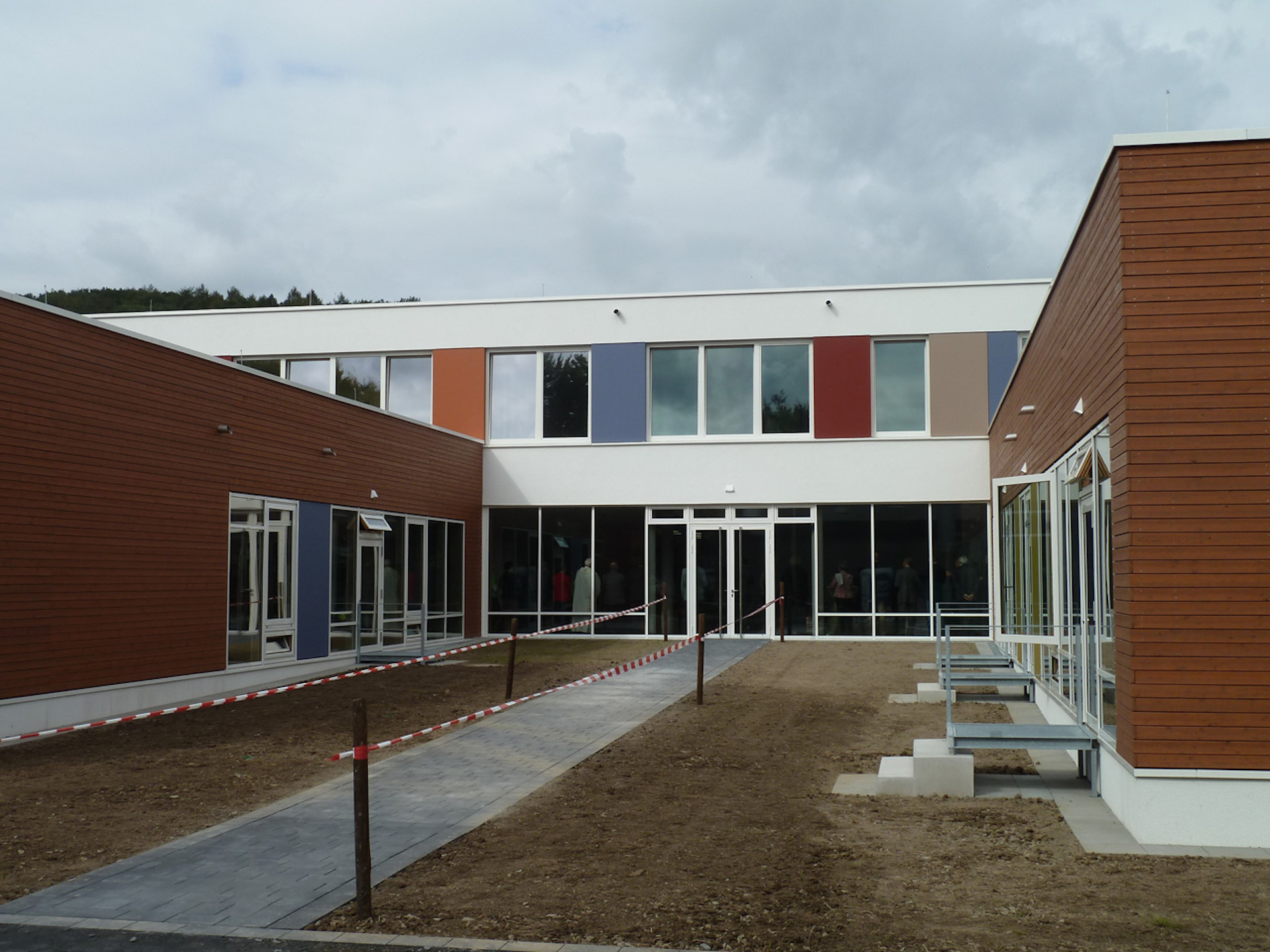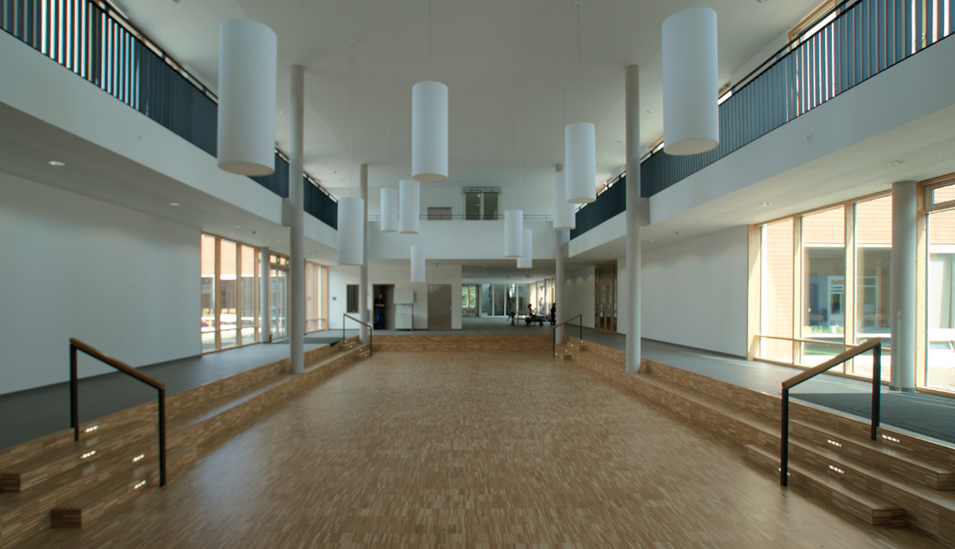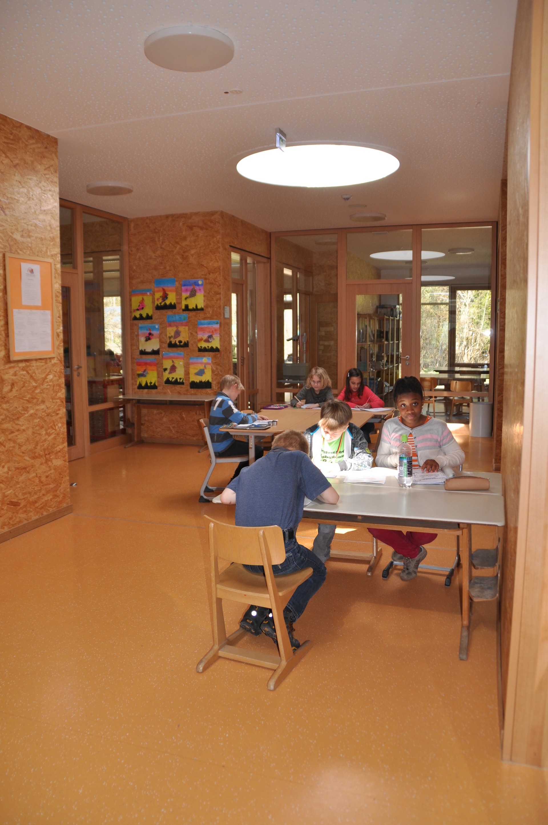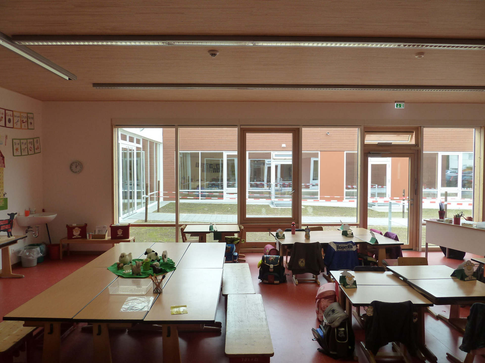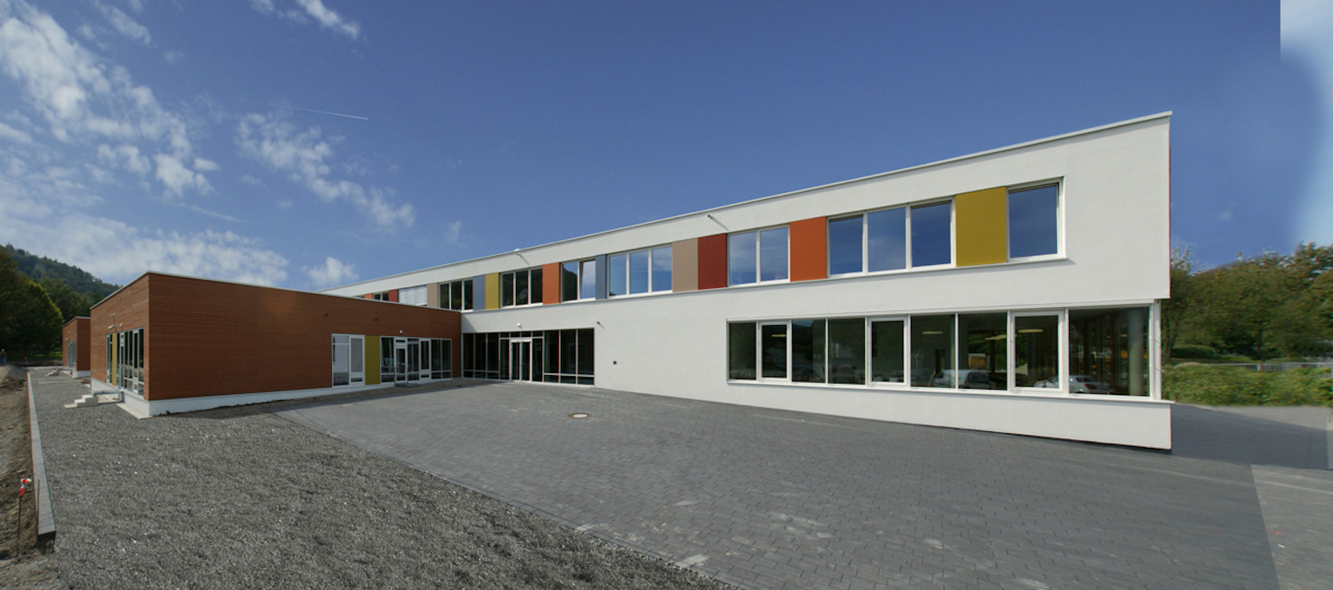 Der Neubau der "Schule unter dem Regenbogen" dockt an die bestehende Turnhalle an und integriert diese in die Gesamtanlage der Schule. Um den zentralen Körper des Rückgrates sind eingeschossig die Teamhäuser angeordnet. Das Rückgrat ist zweigeschossig geplant und enthält die zentralen Funktionen wie Forum, Mensa, Ganztagsbetreuung, Verwaltung und Fachklassen (Musik, Kunst, Computer). In den Teamhäusern sind je vier Unterrichtsräume, windmühlenartig um ein offenes Zentrum (Teamflur) gruppiert. Es werden „Zwischenräume“ als Gruppenräume geschaffen, diese sind durch verglaste Trennwände von den Klassen einsehbar und zum Zentrum des Teamhauses geöffnet. Alle Teamhäuser haben einen direkten Ausgang ins Freie, auf der einen Seite zum Schulhof, auf der anderen in den Landschaftsgarten.
