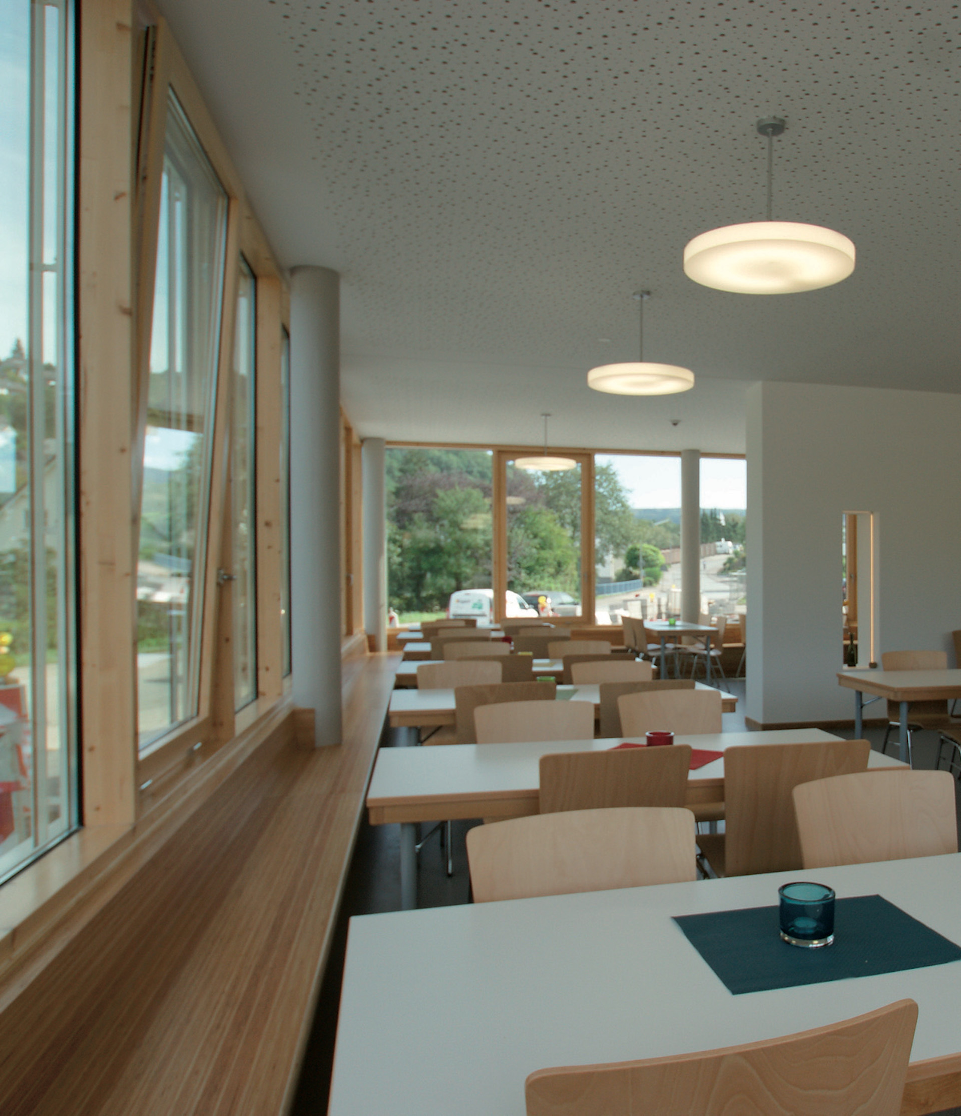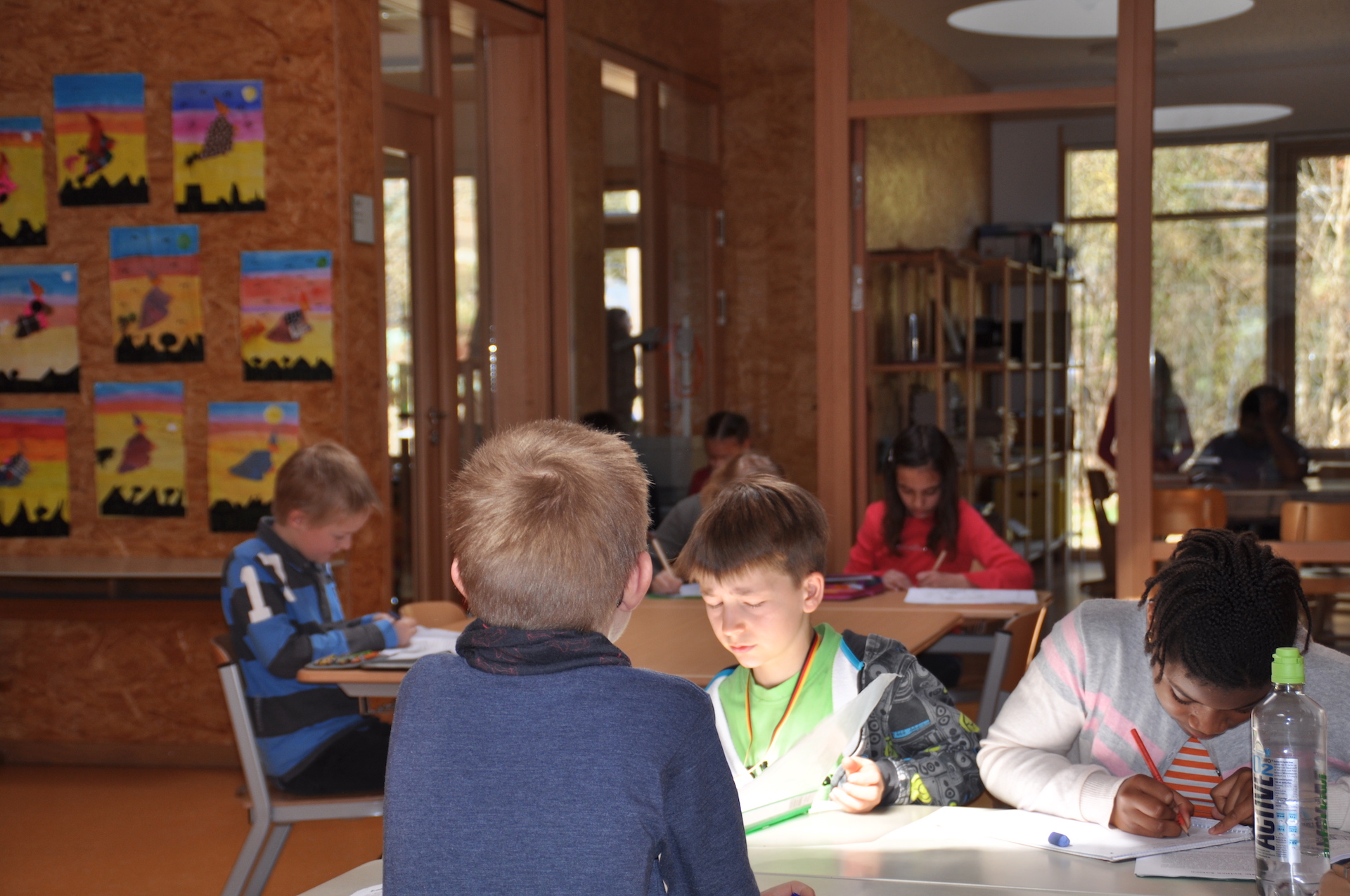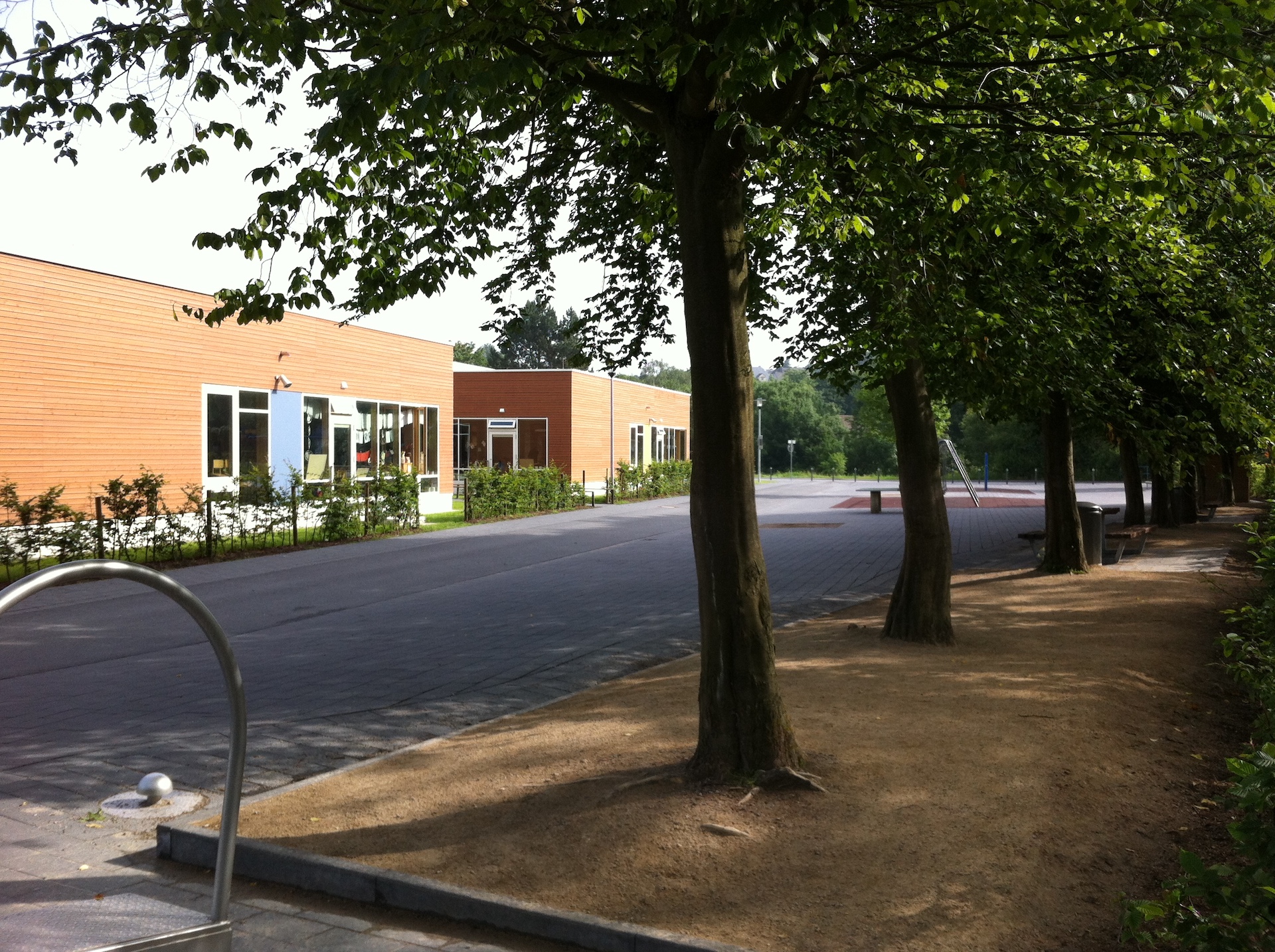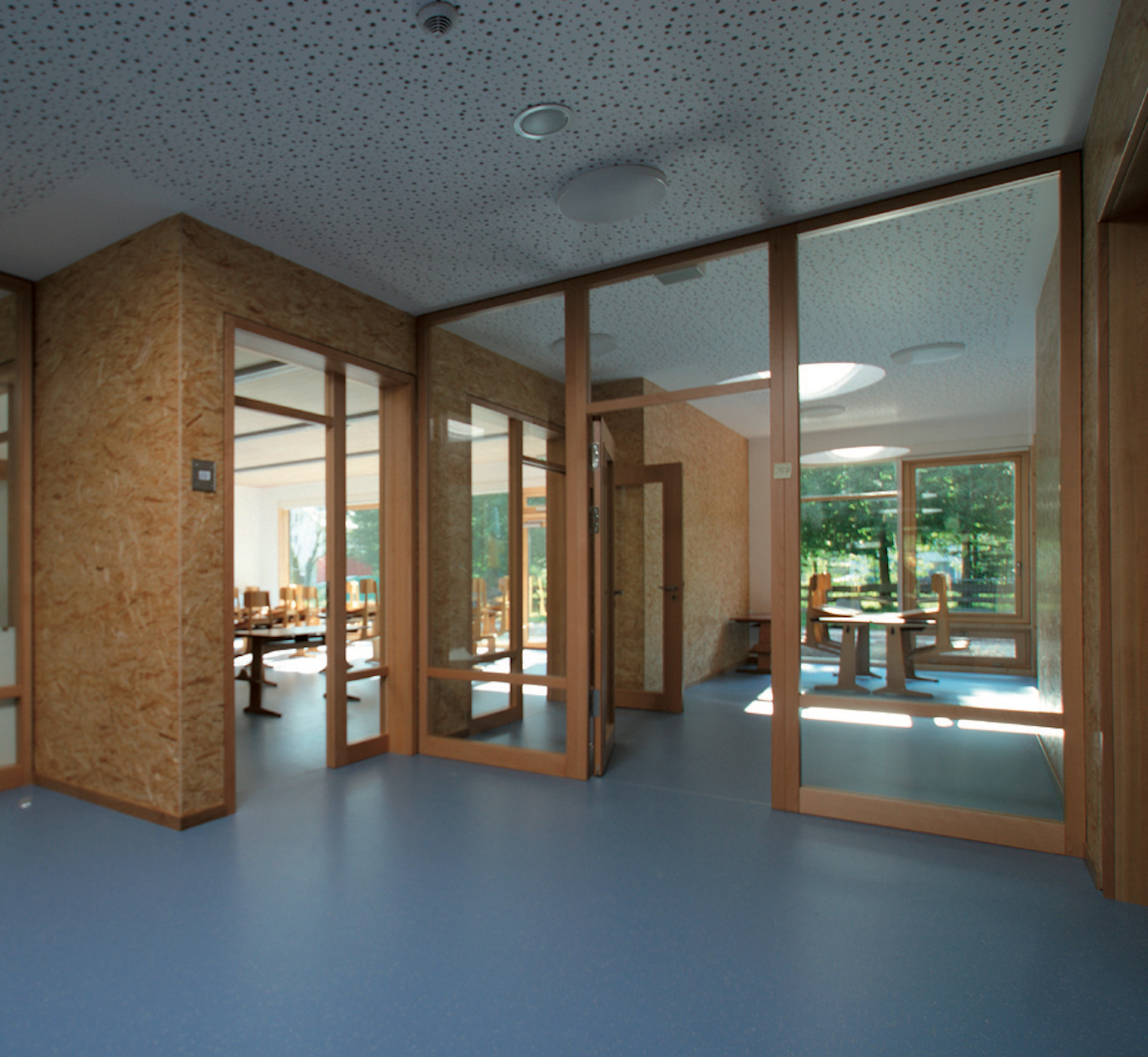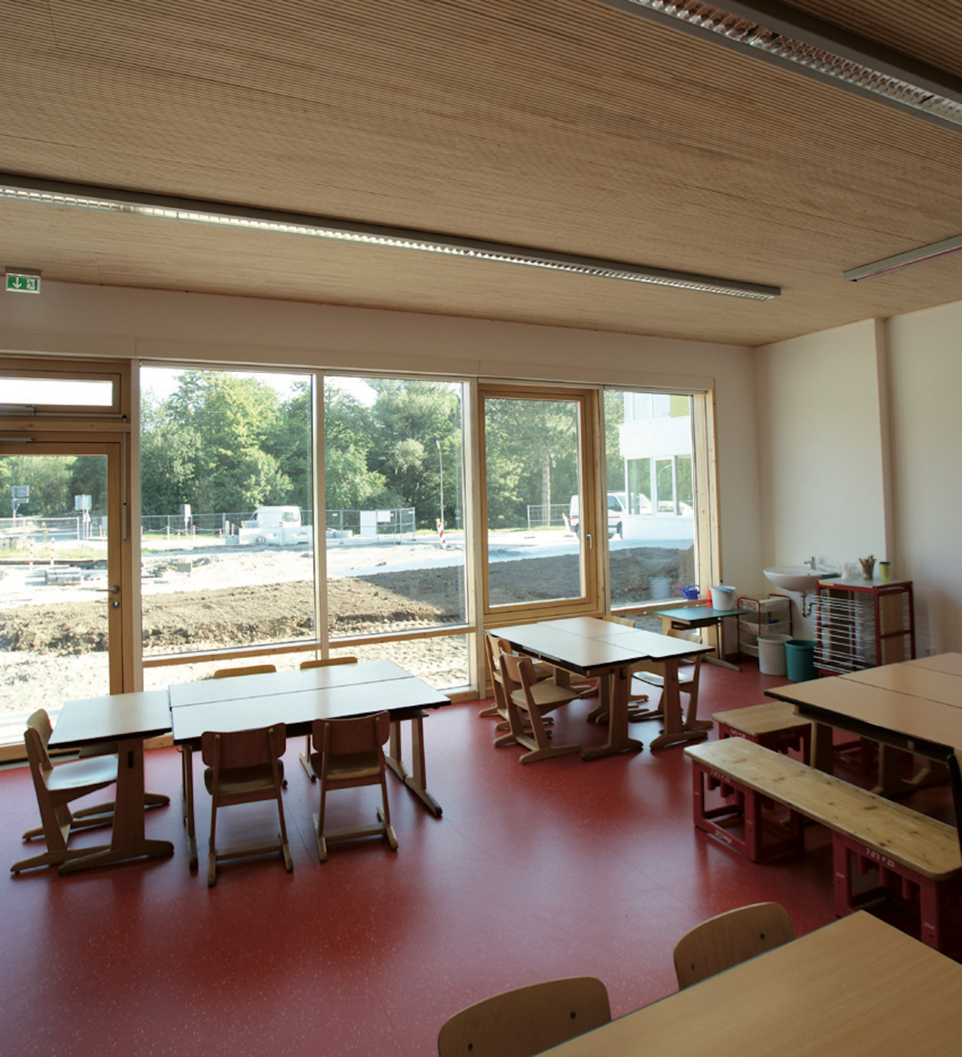 Der Neubau der "Schule unter dem Regenbogen" dockt an die bestehende Turnhalle an und integriert diese in die Gesamtanlage der Schule. Um den zentralen Körper des Rückgrates sind eingeschossig die Teamhäuser angeordnet. Das Rückgrat ist zweigeschossig geplant und enthält die zentralen Funktionen wie Forum, Mensa, Ganztagsbetreuung, Verwaltung und Fachklassen (Musik, Kunst, Computer). In den Teamhäusern sind je vier Unterrichtsräume, windmühlenartig um ein offenes Zentrum (Teamflur) gruppiert. Es werden „Zwischenräume“ als Gruppenräume geschaffen, diese sind durch verglaste Trennwände von den Klassen einsehbar und zum Zentrum des Teamhauses geöffnet. Alle Teamhäuser haben einen direkten Ausgang ins Freie, auf der einen Seite zum Schulhof, auf der anderen in den Landschaftsgarten.